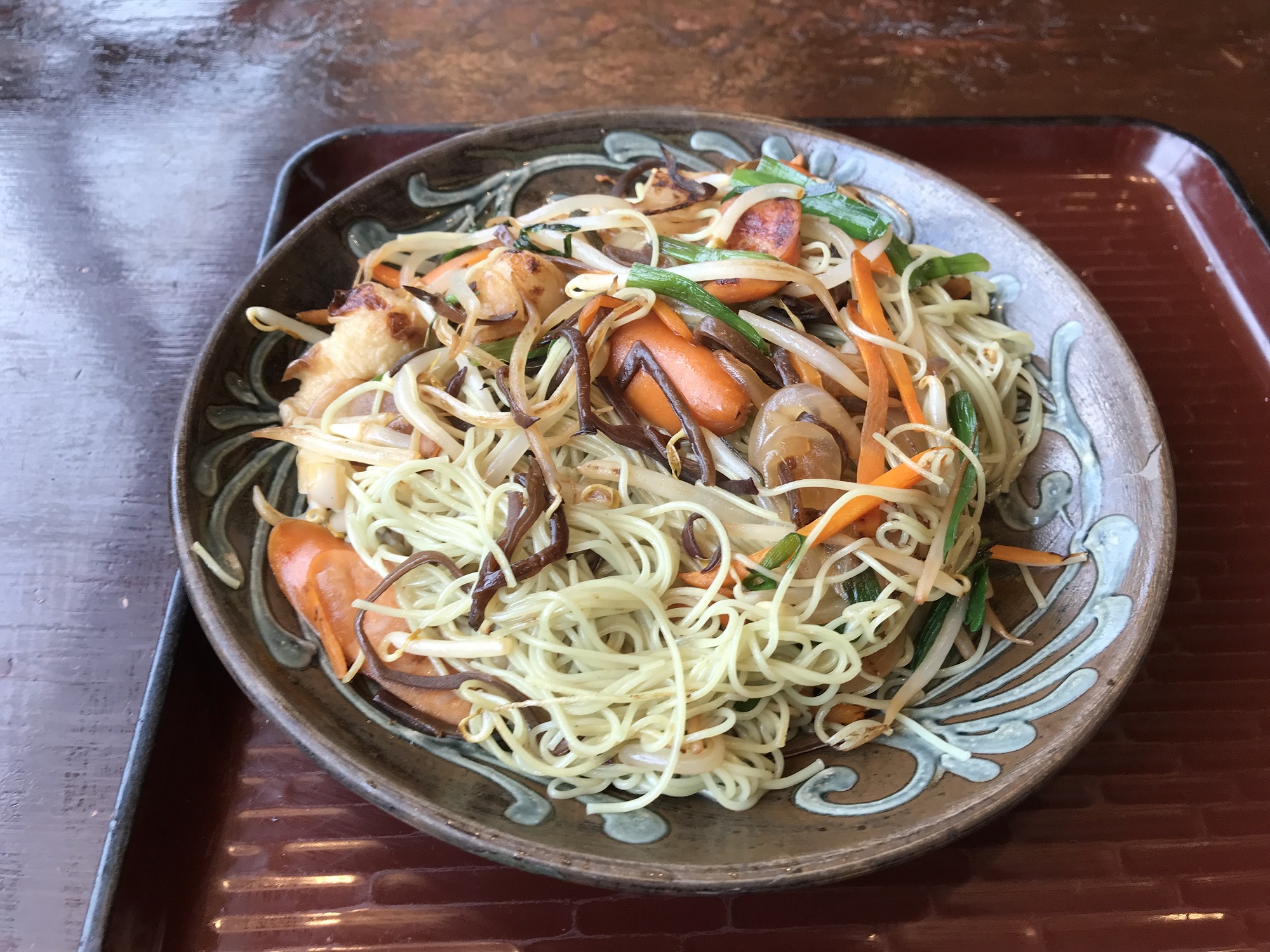 続いて、ゴーヤソーメンチャンプルを注文。沖縄県の常識で、そうめんは炒めて食べるものなんですね。で、具材はというと、ニンジンや玉ねぎ、ソーセージ、ちくわなど・・・て、