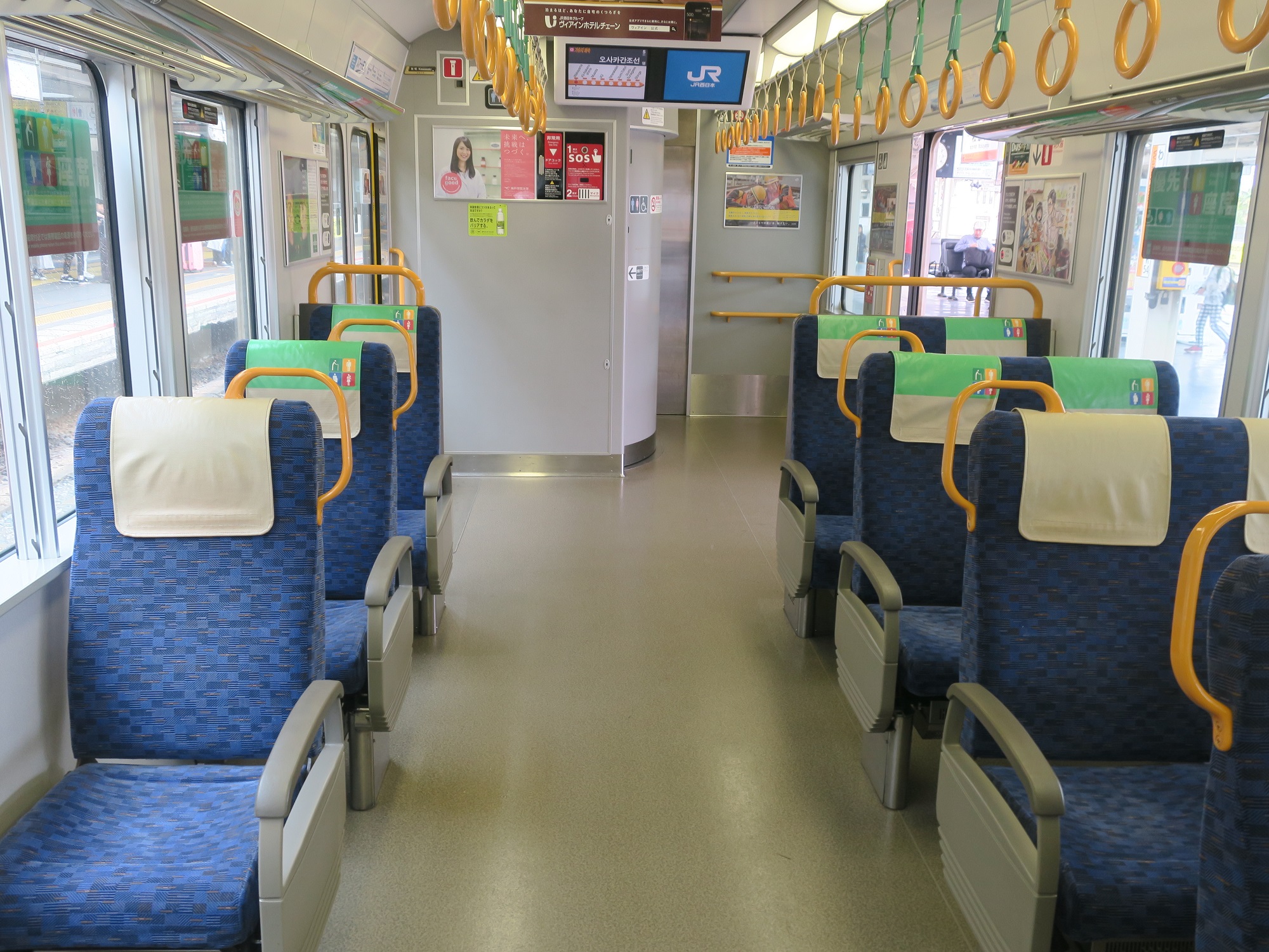 座席は、1人掛けと2人掛けがあります。なぜこのレイアウトにしたのかというと、一説には関空快速の乗客が大きな荷物を持っているため、と言われています。でも、ラッシュ時には良さそうに思うんですけどねー。