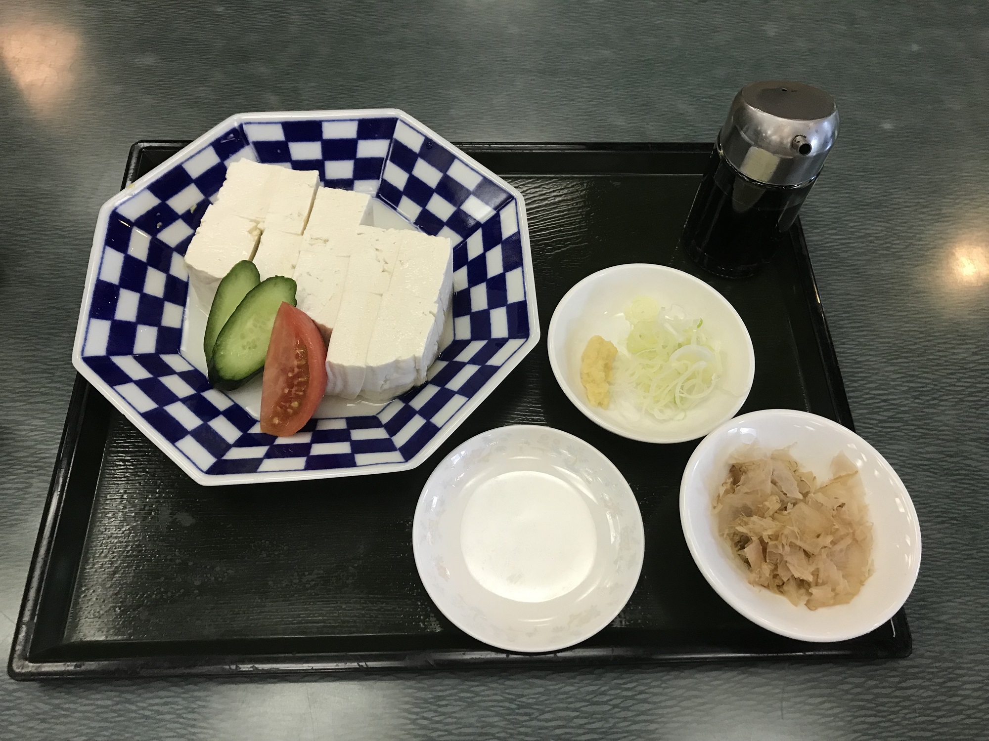 最初に頼んだのが、冷や奴でした。これ、ちょっとキューティー吉本的には予想外だったのですが、木綿のお豆腐が1丁丸ごと出てきました。まさか冷や奴でこれだけの分量があるとは思ってなかったです。お味ですか? 普通に普通のお豆腐でした。