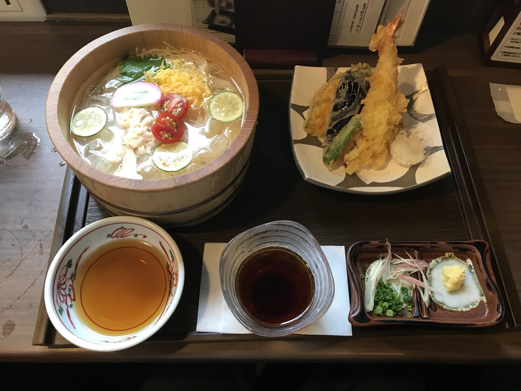 最後は、天ぷらと夏の彩りそうめん。夏の限定メニューでして、1,180円とお高かったのですが、そうめんって珍しいなということで頼んでみました。天ぷらを肴に飲んで、〆にそうめんを食べる戦略です。