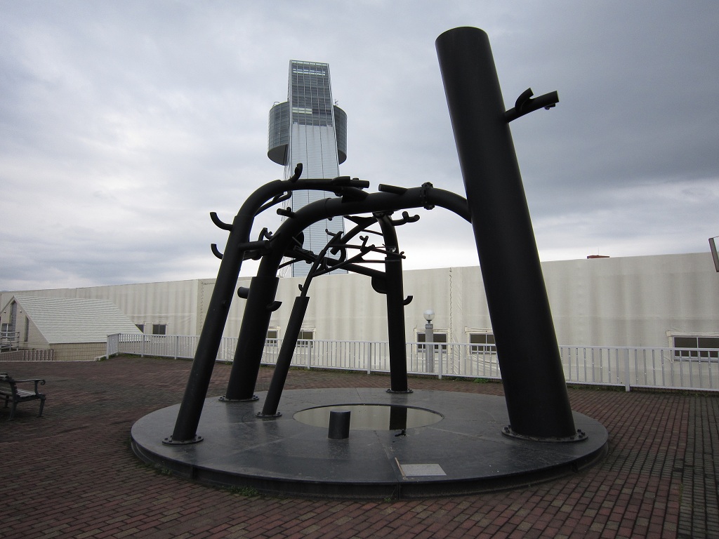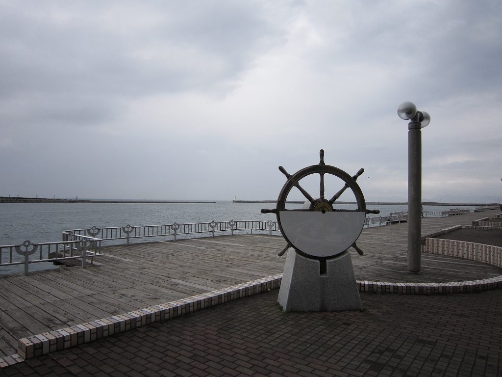 ちなみに遊歩道には、色々なオブジェが置いてあります。写真は、船の舵を切るためのハンドル(・・・て、これ正しくは何ていうのかなぁ)をかたどったオブジェですね。