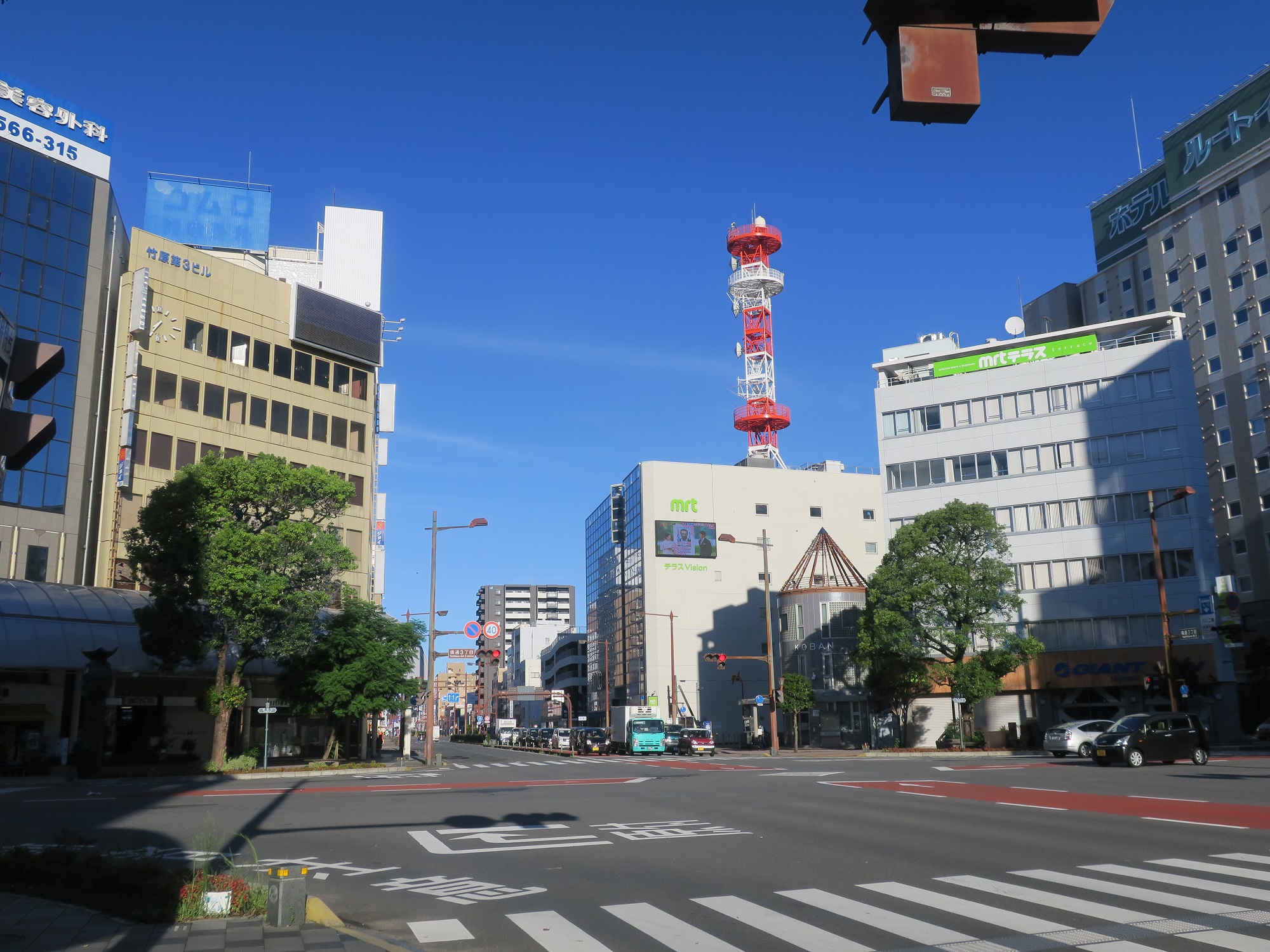 県庁前交差点です。その名の通り、宮崎県庁のすぐ近くです。繁華街はここまでです。橘3丁目交差点から、歩いて10分ぐらいでしょうか。