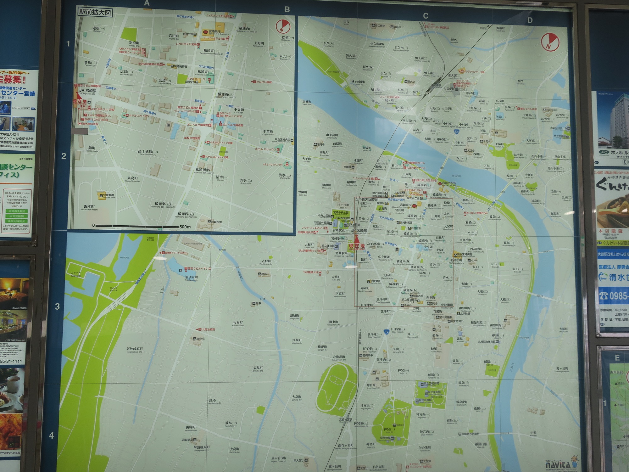 宮崎駅にある、駅付近案内図です。宮崎市の繁華街の中心部、橘通り3丁目付近が拡大されています。