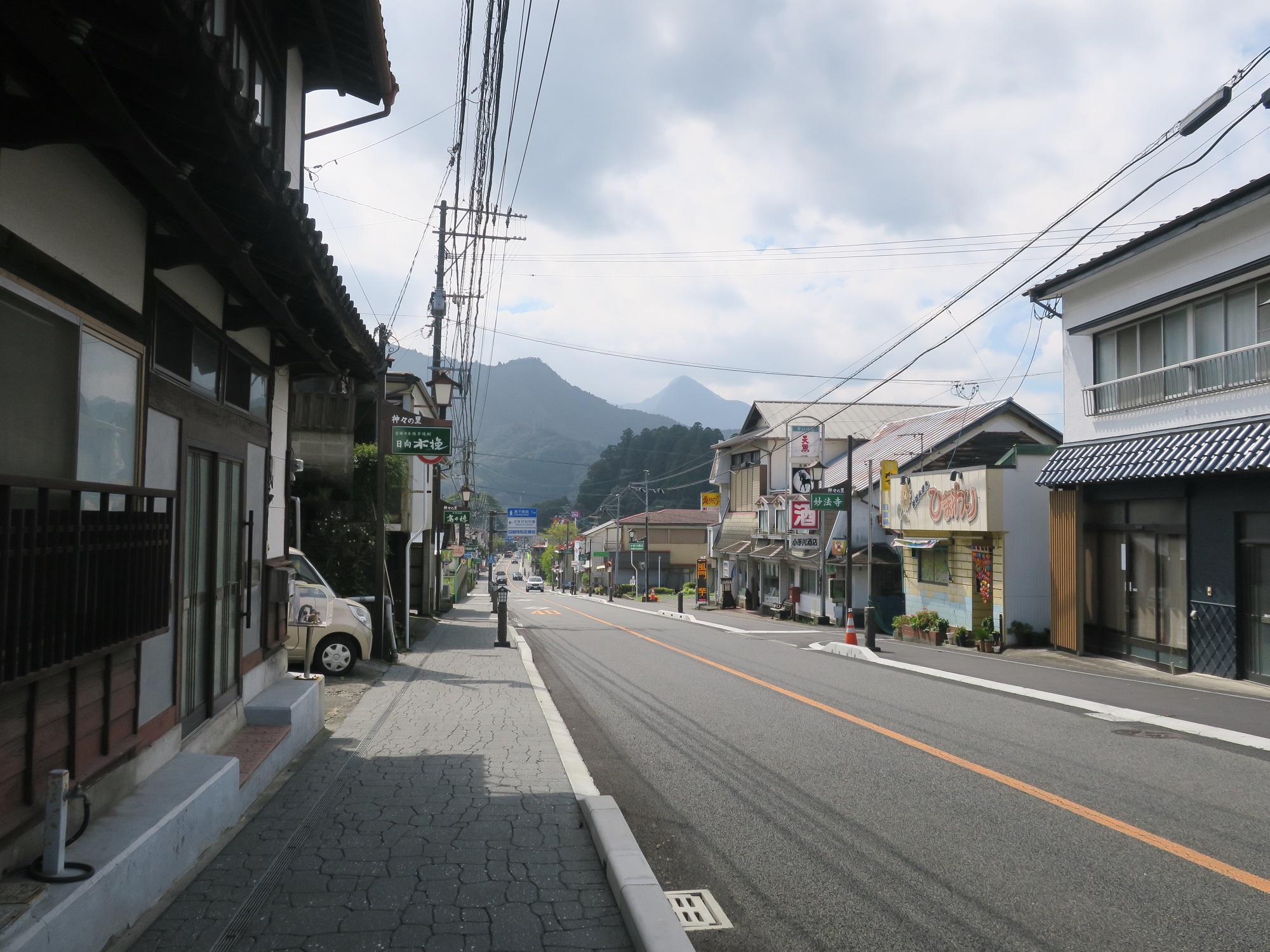 これが高千穂町のメインストリートですか。商店が立ち並びます。コンビニや飲食店もあるので、食べるものには困らないと思います。