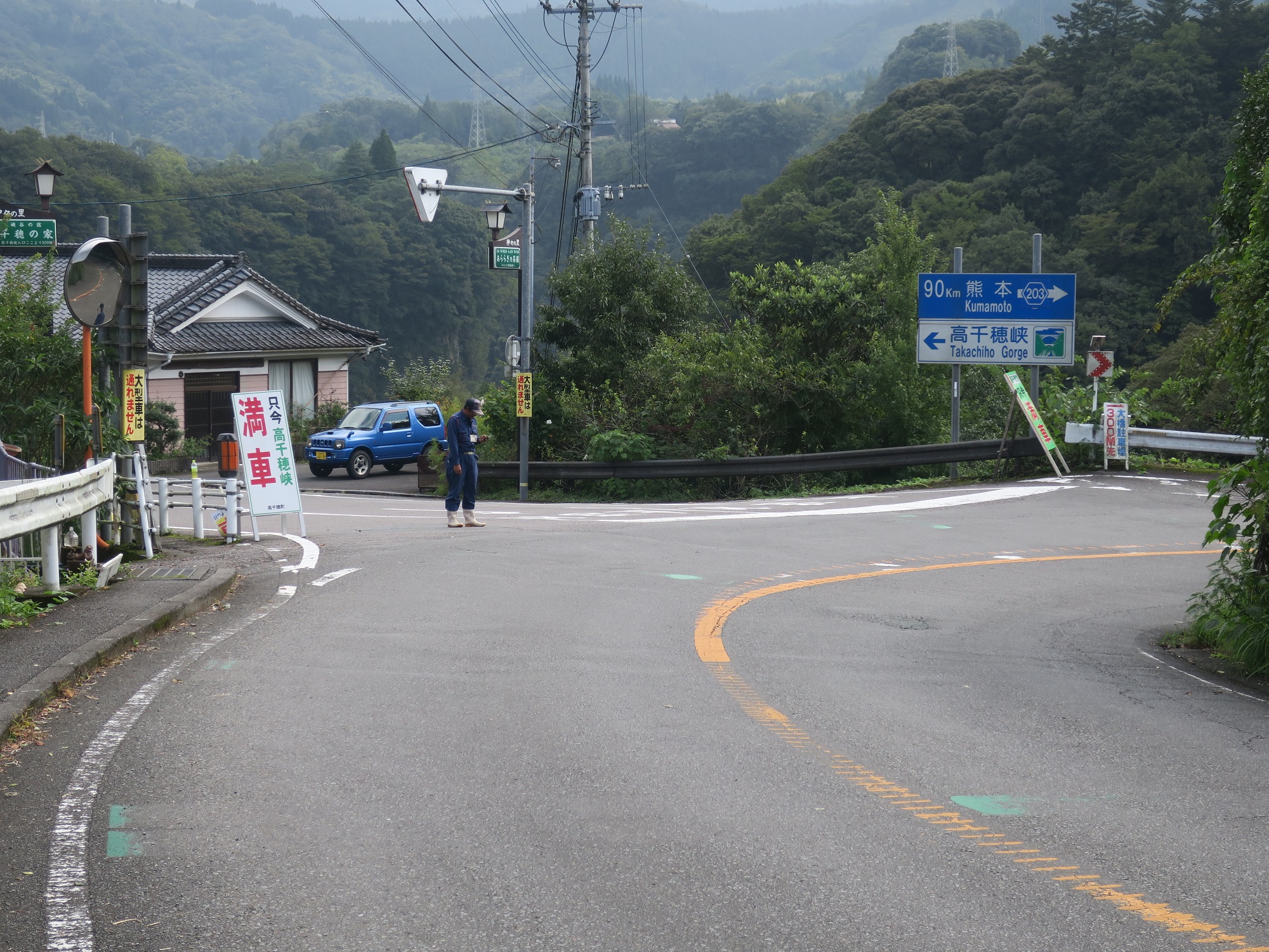 その先を左に曲がると高千穂峡なのですが、駐車場は満車らしいです。でもって、高千穂バスセンターから歩くととんでもない距離を歩かないといけないのです。はて、歩いていくべきか、車で行くべきか。キューティー吉本的には、これは1日数便のマイクロバスでもいいから、ここは高千穂バスセンターから高千穂峡までのバスを運転するべきですね。