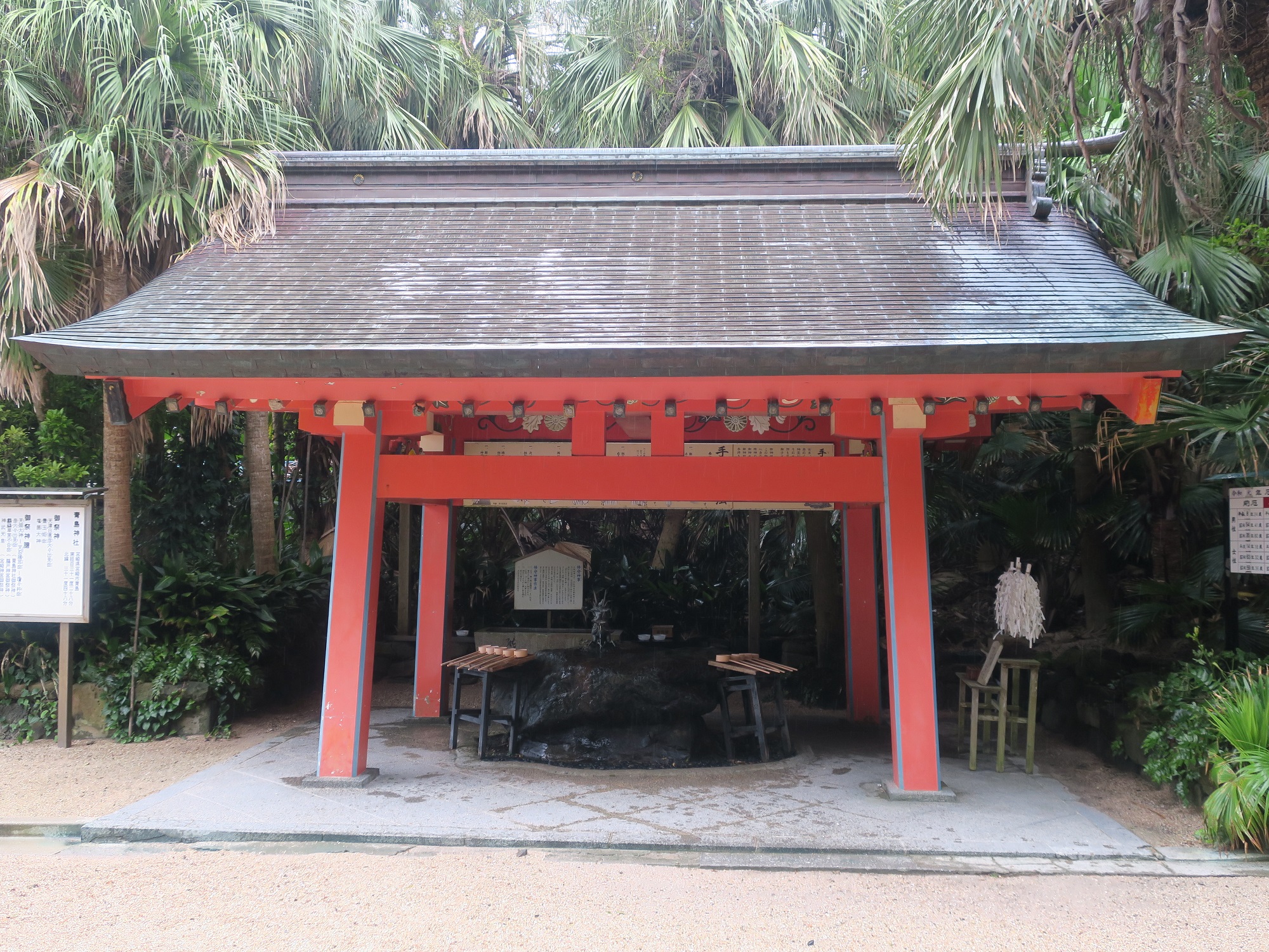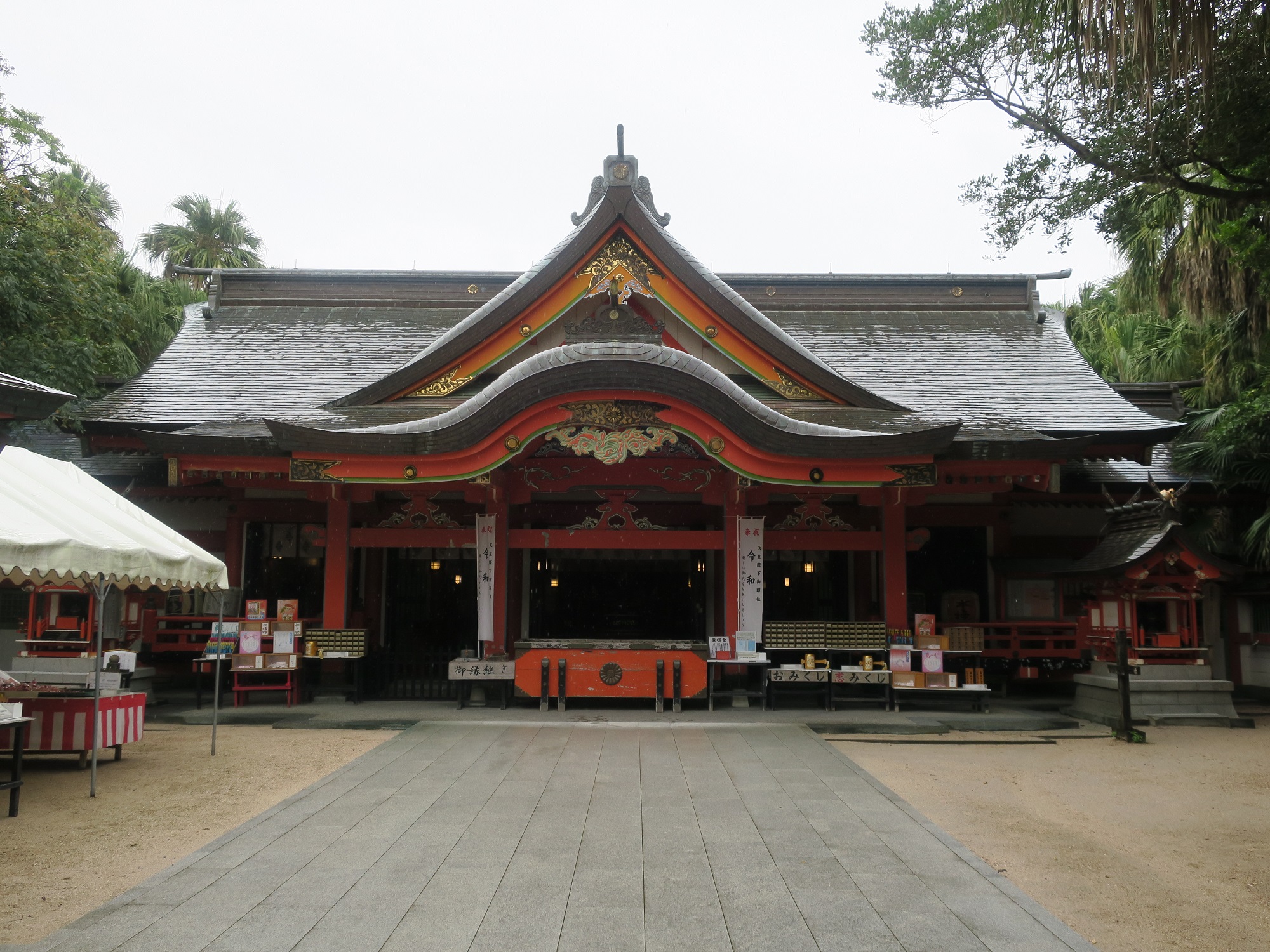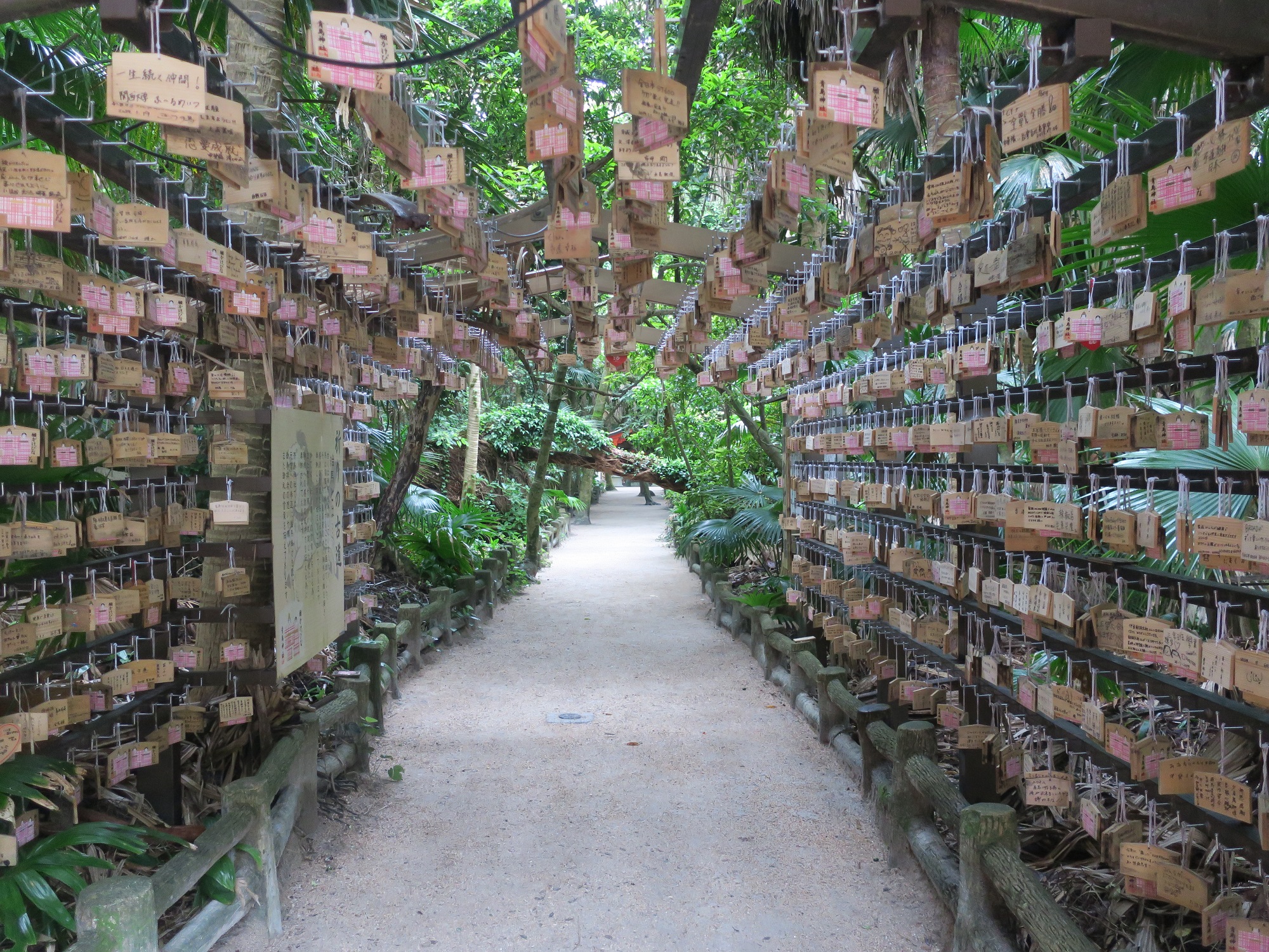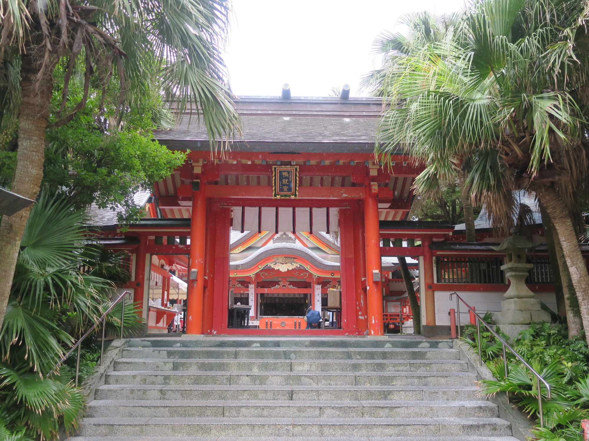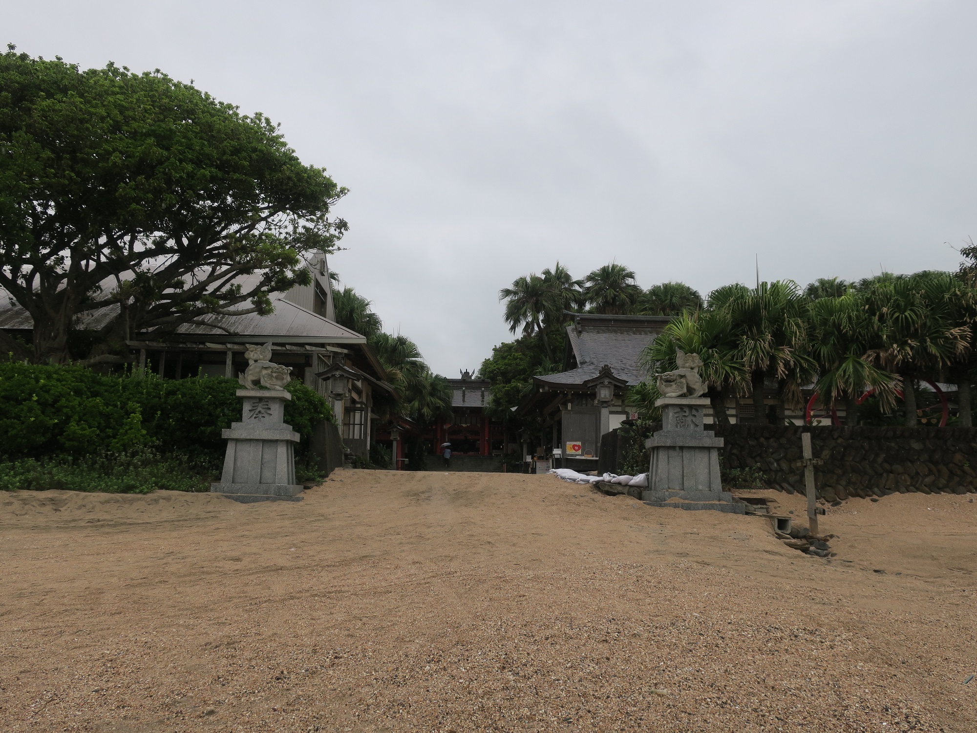 入り口を入った先の、境内です。立っている木々を見ると、いかにも南の島の神社って感じですね。それもそのはず。青島には亜熱帯性の植物が群生していまして、青島神社はその中にあるんです。