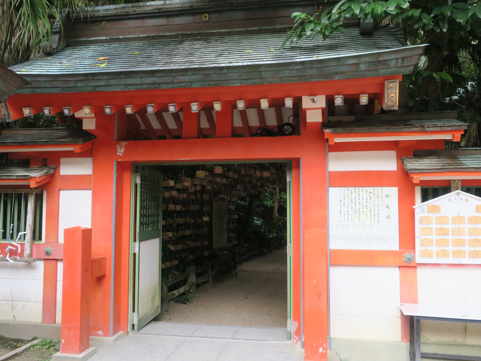 その門の先はというと、絵馬がいっぱいぶら下がっているから神社の中だとわかるのですが、もし絵馬がなかったらとてもここが神社とは思えないでしょう。しかも、その先に気が倒れています。ま、これは台風の影響なんでしょうねぇ。