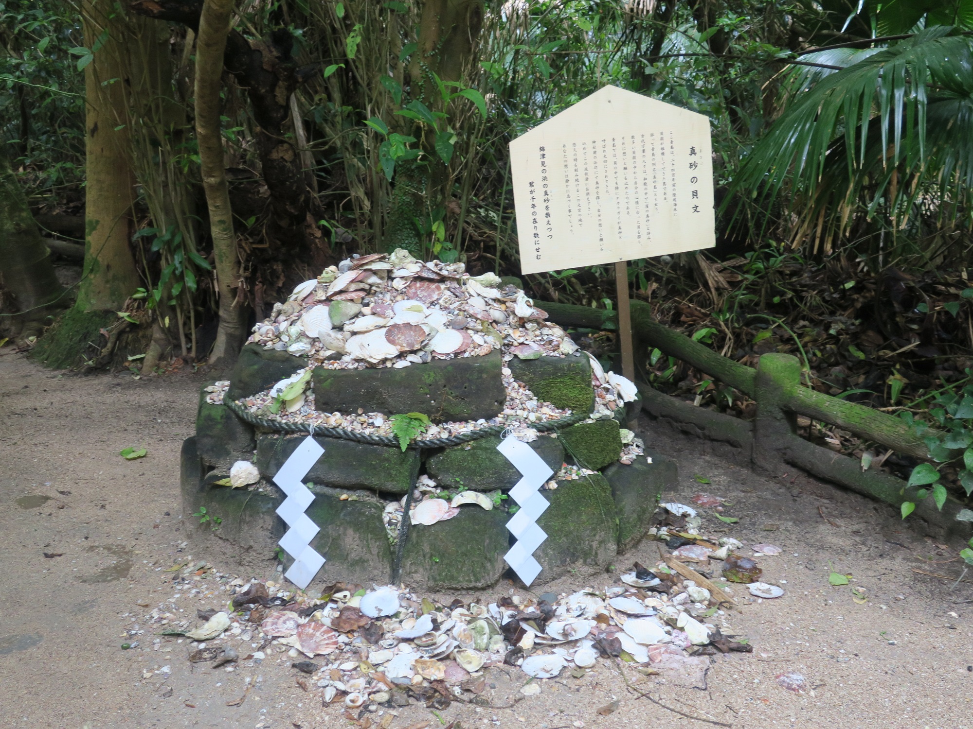 本宮の奥に、真砂の貝文があります。青島は岩盤が隆起した後、貝殻が堆積して出来上がりました。このため、青島の別名を真砂島とも言います。