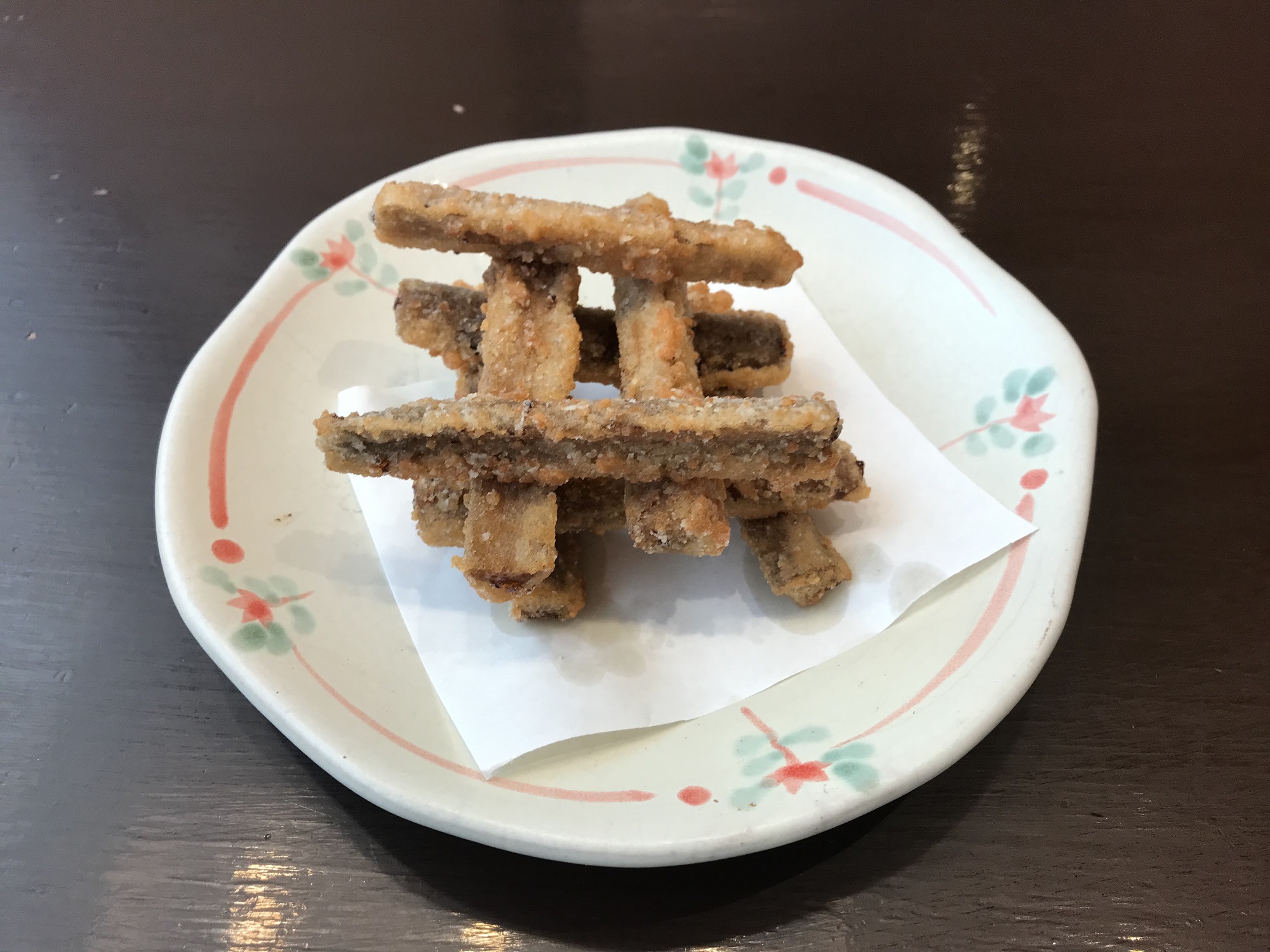 で、今日の呑みです。食物繊維が取れそうという単純な理由で、ごぼうの唐揚げを注文。想像していたよりも濃い系のお味でした。ビールには合うんですけどね。