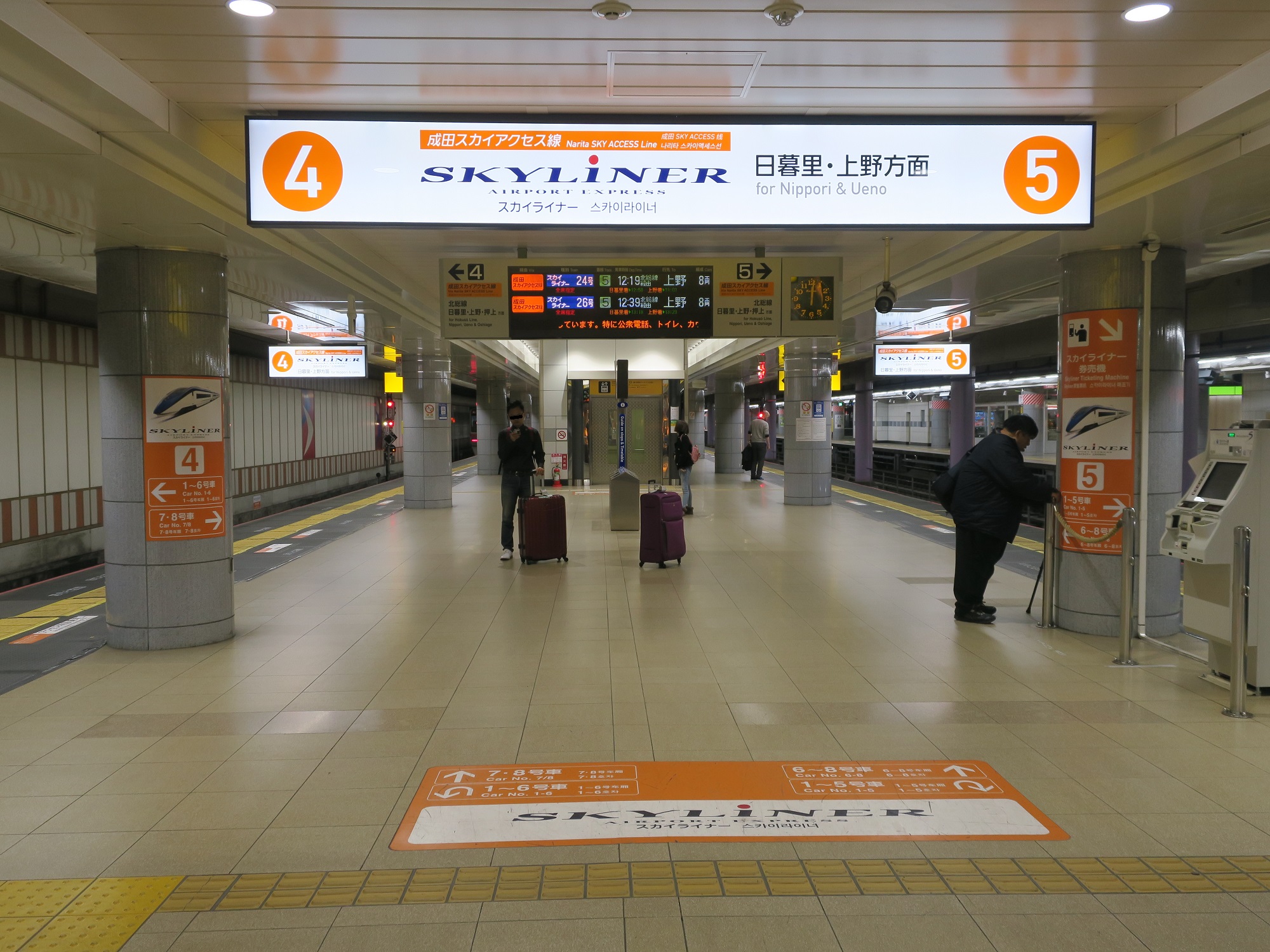 改札口から一番手前にあるのが、4番線・5番線です。主に成田スカイアクセス線を経由して、日暮里・上野方面に行くスカイライナーが発着します。