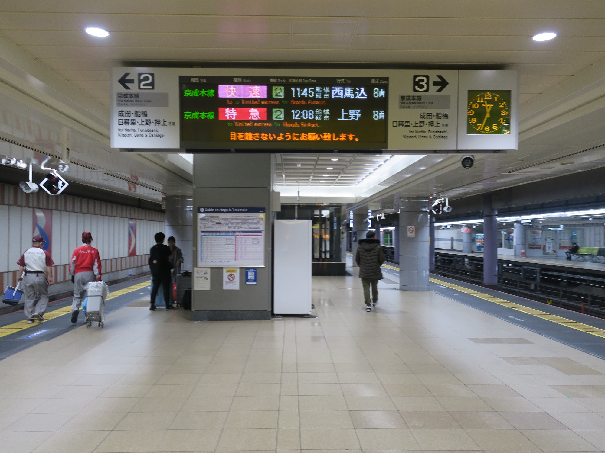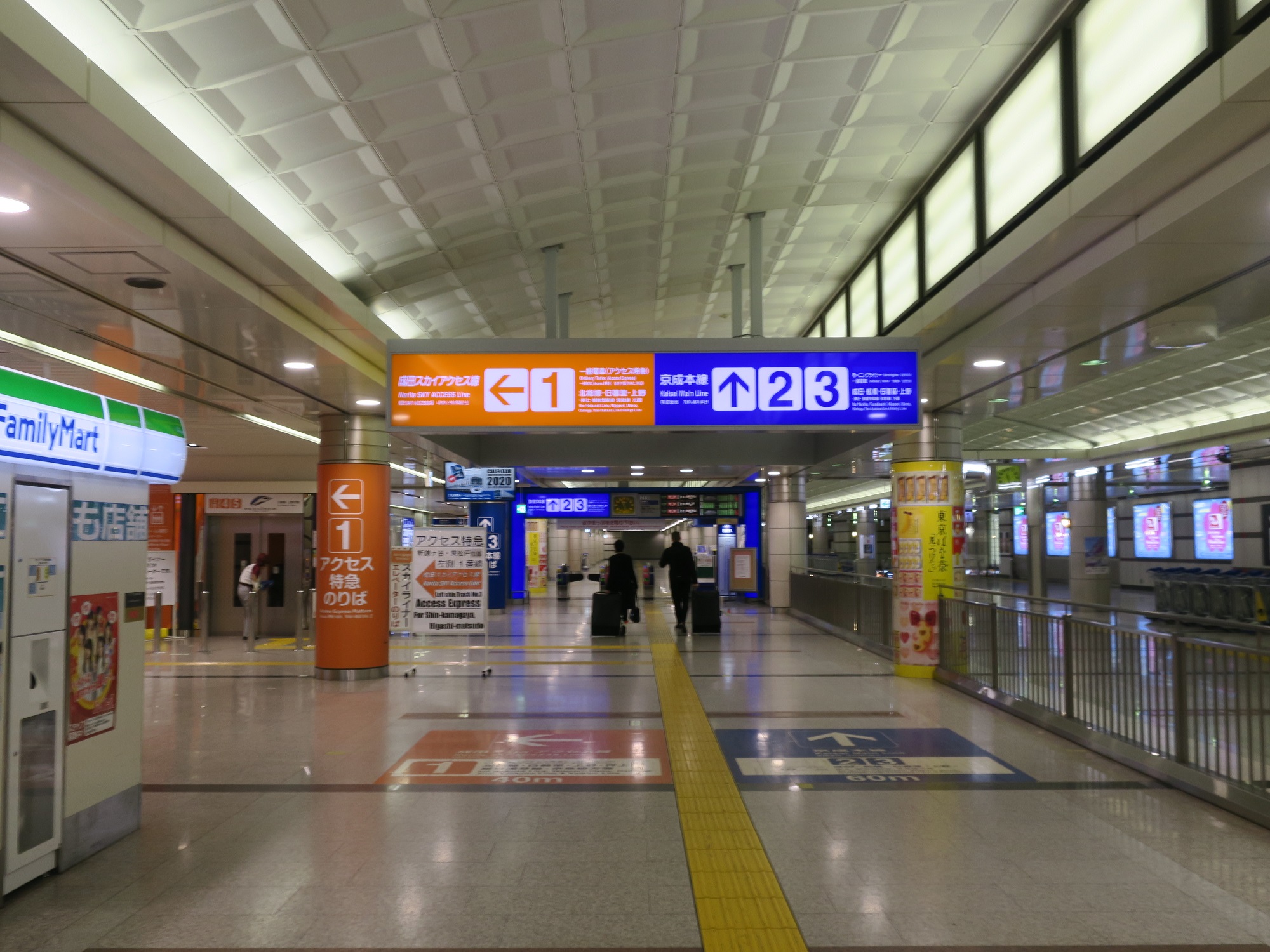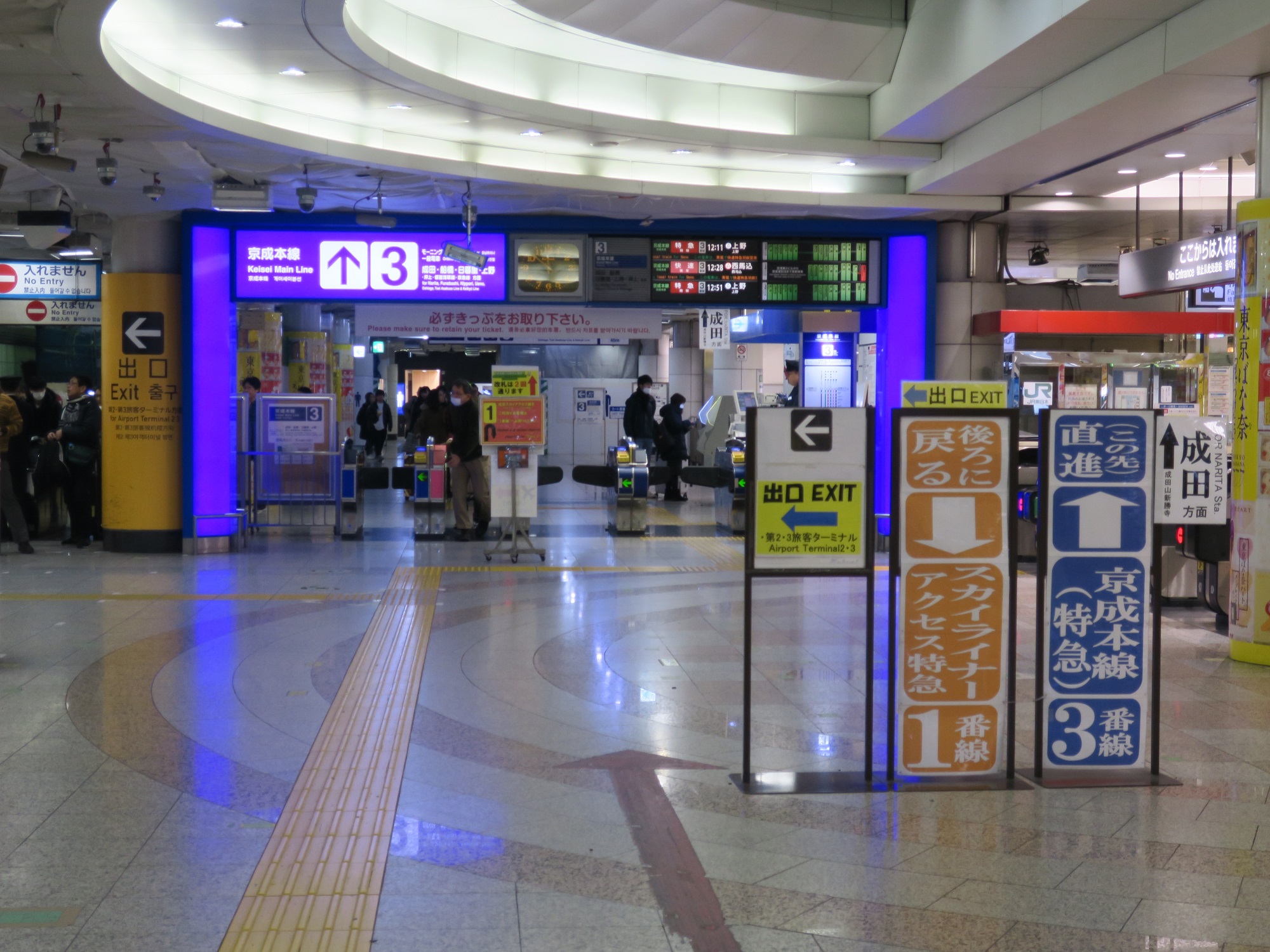 で、2番線・3番線の手前に、中間改札口があります。なぜかと言うと、京成本線経由と成田スカイアクセス線経由では運賃が異なるからです。そこで、どっちを経由したかがわかるよう、京成本線経由の場合は中間改札口を通ると言う訳です。ICカードの場合は、入口の改札口と、中間改札口の2か所でタッチします。