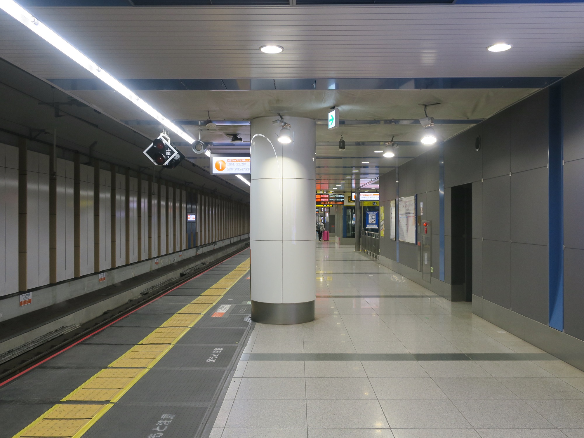 1番線です。主に成田スカイアクセス線で、千葉ニュータウン中央・押上・上野方面と、都営浅草線を経由して西馬込方面、京急線を経由して品川羽田空港方面に行くアクセス特急が発着します。