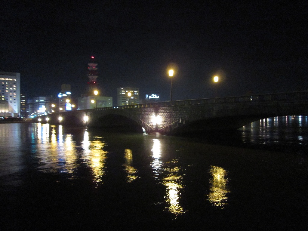 萬代橋は、夜になるとこんな感じでライトアップされます。これはこれで、きれいですねー
