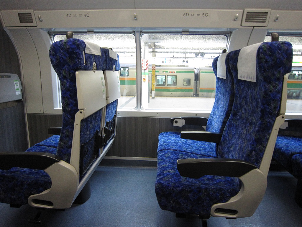 列車は2階建てになっています。2階席は、こんな感じです。東京駅から進行方向左側に座ると、平塚より先で海が見えます。眺めはとってもいいのですが、荷物を置く網棚がありません。大きな荷物を持っている人は、平屋の席に座ったほうがいいでしょう。
