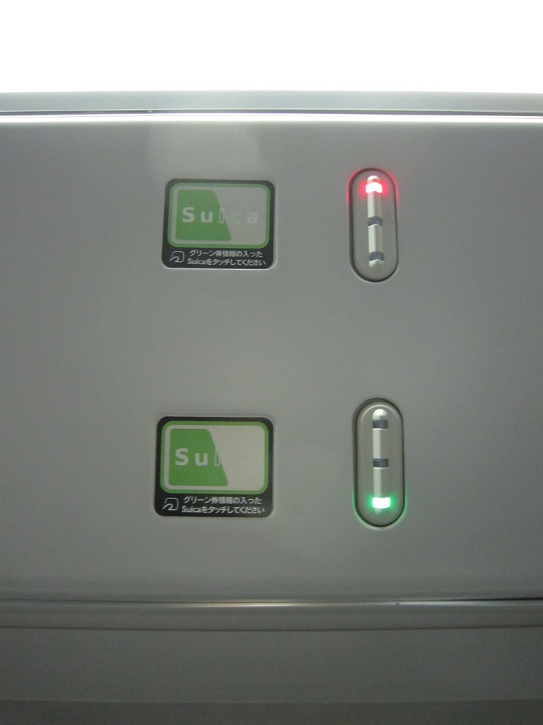 座席の上には写真のようなSuicaリーダーがついていまして、ここにSuicaをタッチします。これが、車内改札の代わりになっていまして、Suicaをタッチすると、LEDが赤→緑に変わります。席を移動するときは、移動先の席の上にあるSuicaリーダーにタッチすればOKです。