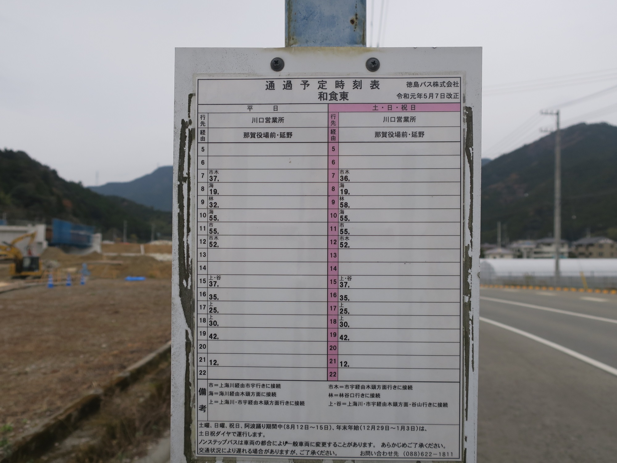 太龍寺ロープウェイへは、徳島駅か阿南駅か桑野駅で、川口営業所行きの徳島バスに乗ります。最寄りバス停は和食東なのですが、バスの案内には「わじき東」と表示されるので、注意してください。