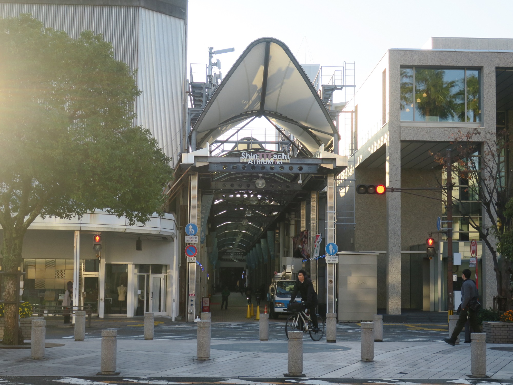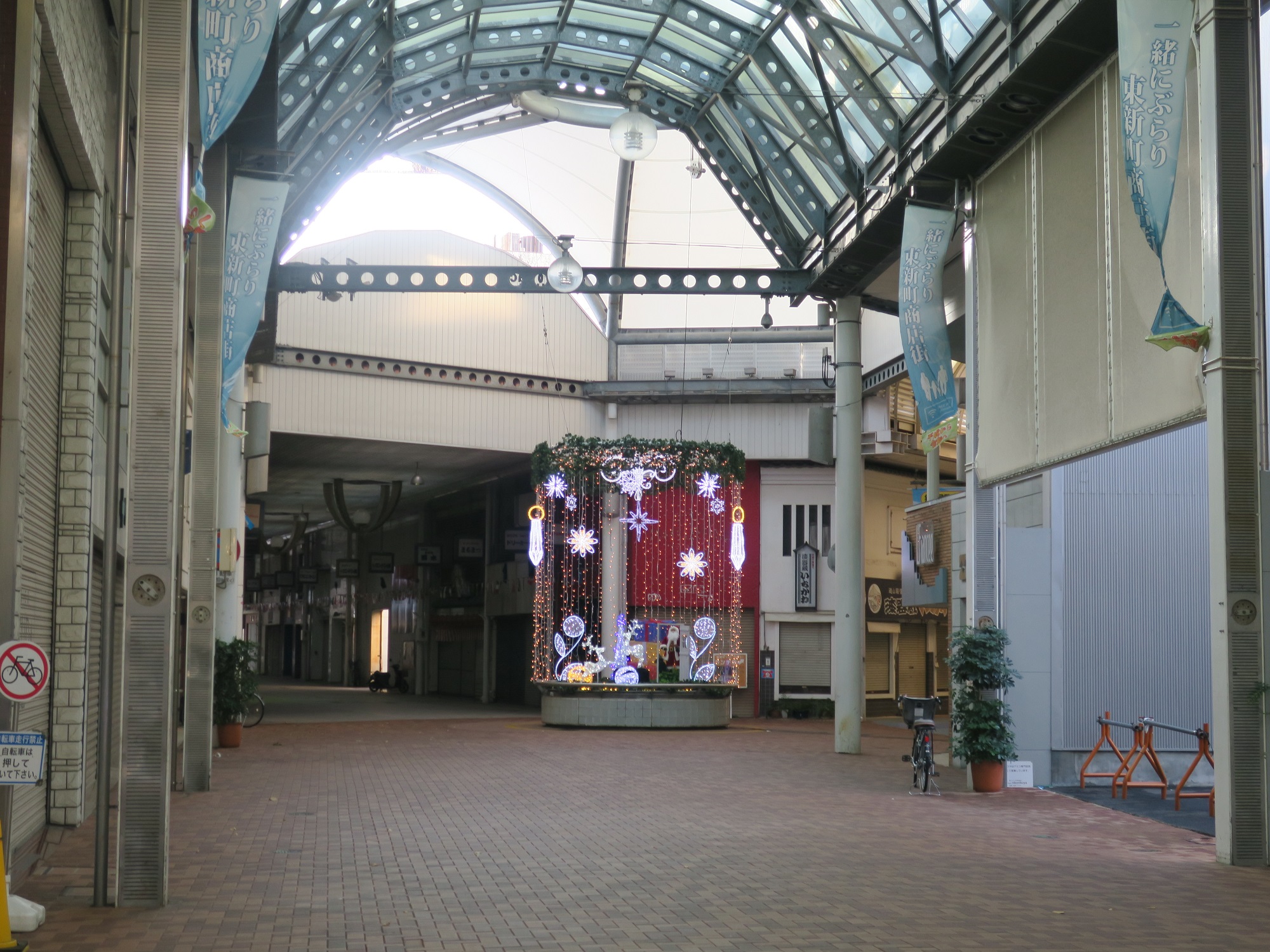 こちらが、東新町商店街の中です。撮影しているのは朝なので、どの店もシャッターが下りています。