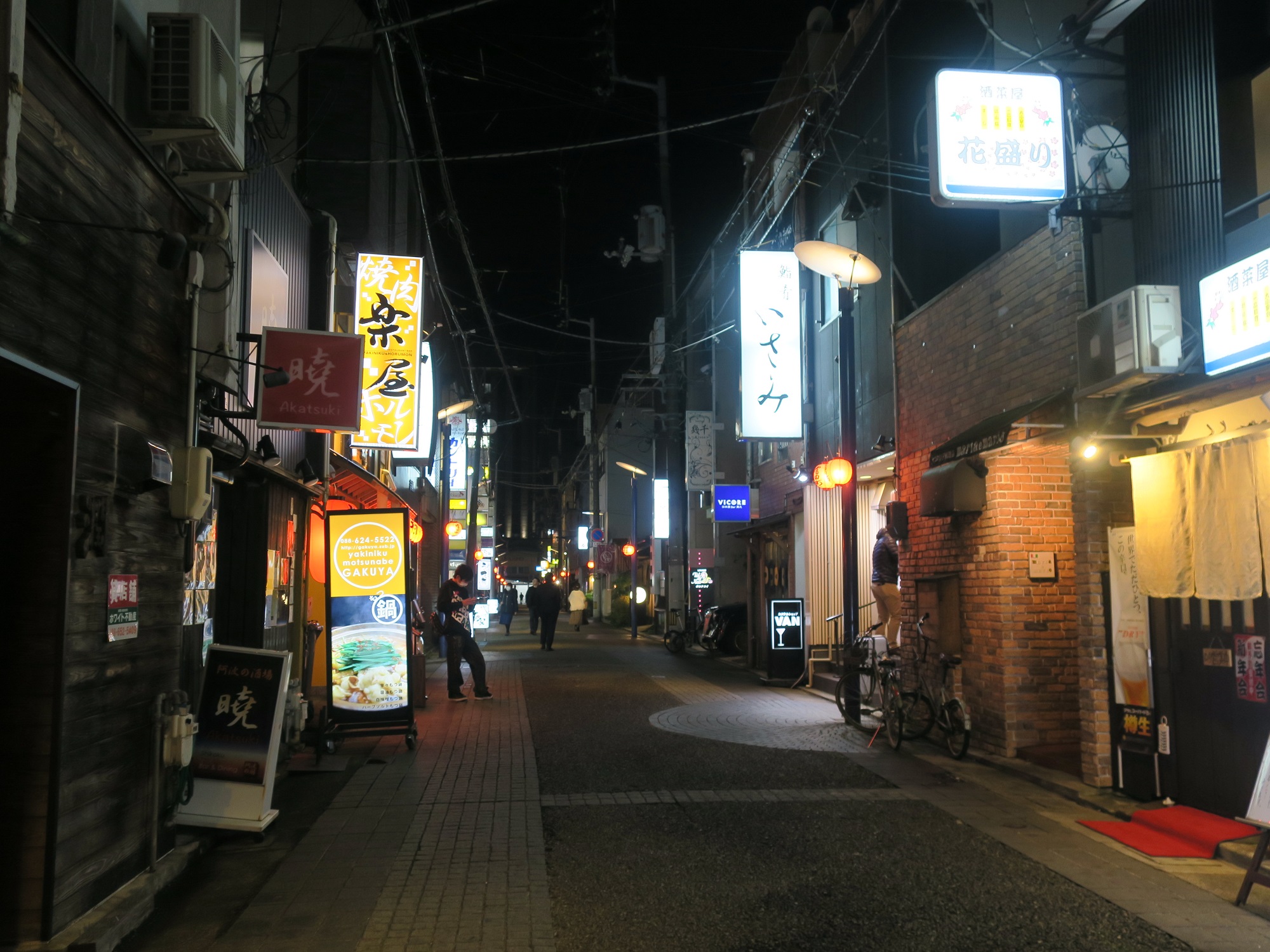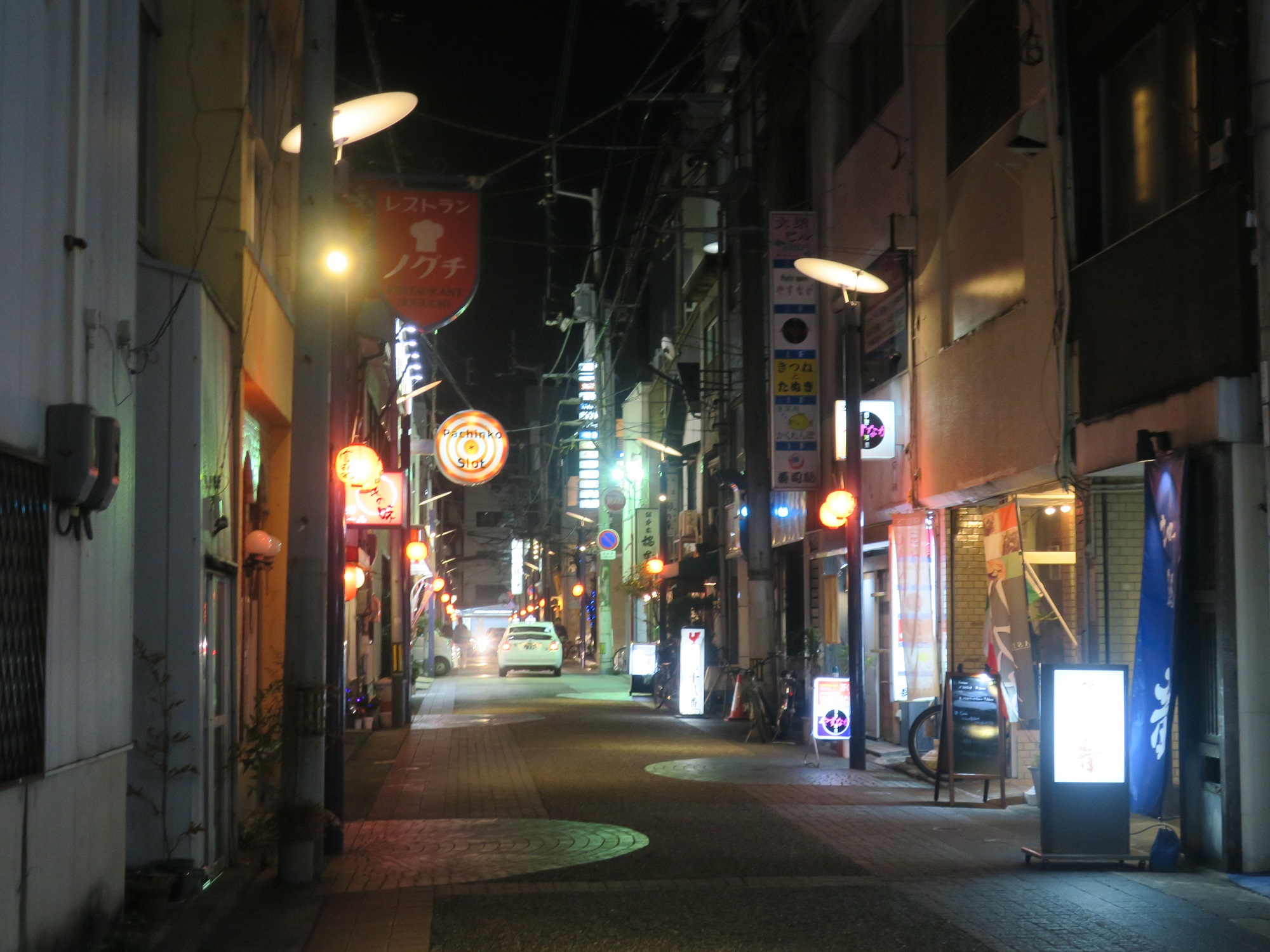 夜に撮影すると、ご覧の通り。飲み屋さん系の飲食店がずらりと立ち並んでいるのがお分かりいただけると思います。