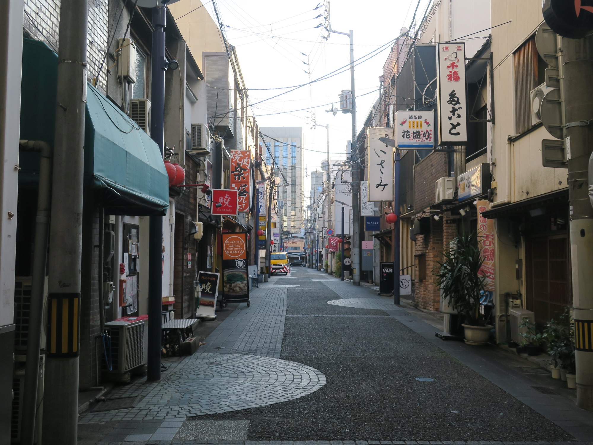 アーケード街から横道にそれると、飲食店が立ち並びます。朝はご覧の通り、殺風景なのですが・・・