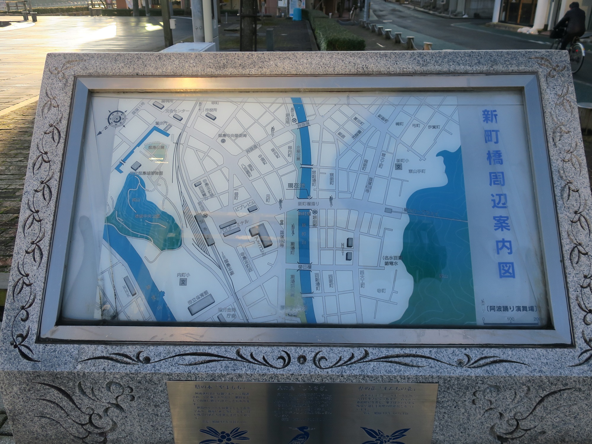 新町橋を渡った先が、こんな感じ。ちょっと見にくいかも知れませんが、その先には阿波踊り会館があります。