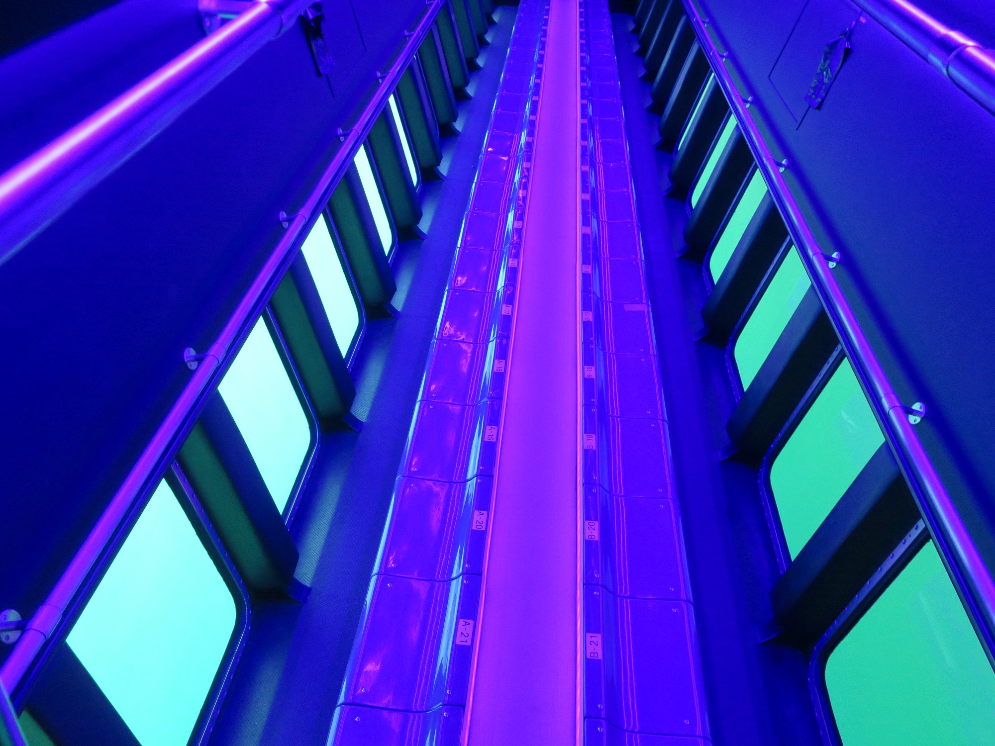 水中観潮船 アクアエディ号の船内です。液晶モニターが並んでいるように見えますが、そうではありません。ガラス張りになっていまして、海中を見ることができるんです。
