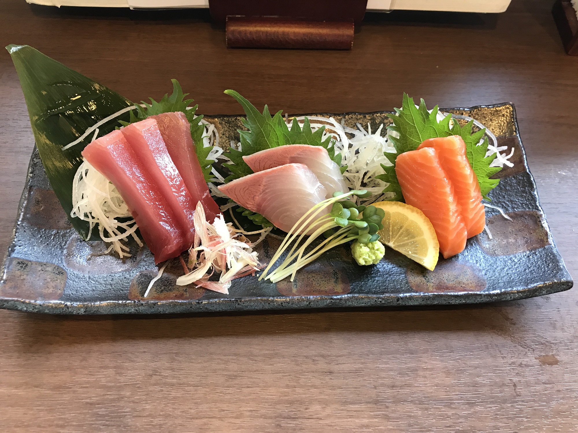 続いて、お刺身の三種盛り。マグロとかんぱちとサーモンです。980円でした。これは以前頼んだことがありますよね。
