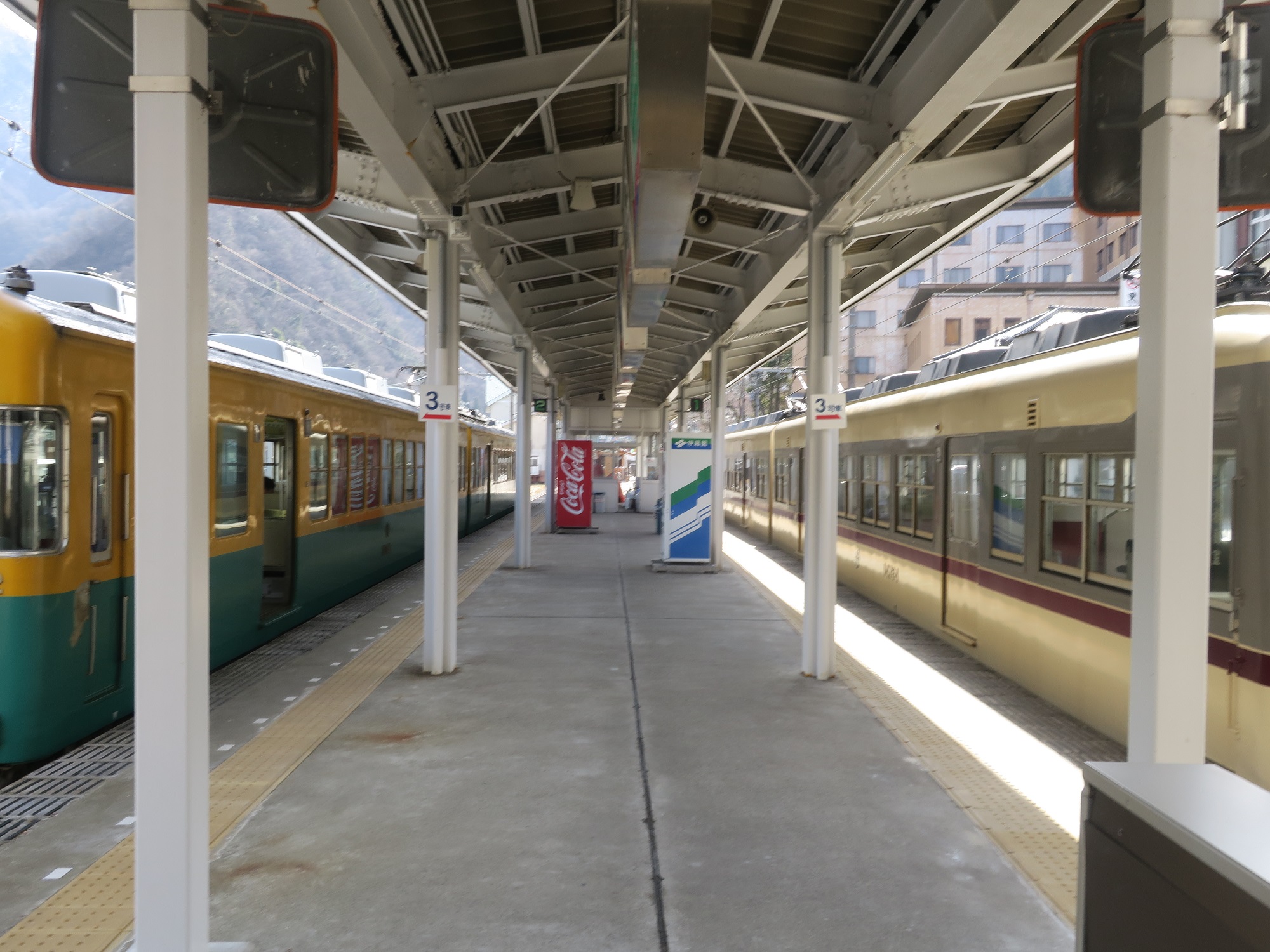 駅構内です。左が富山地方鉄道、右が黒部渓谷鉄道です。すぐ隣り合わせであることがお分かりいただけるかと思います。
