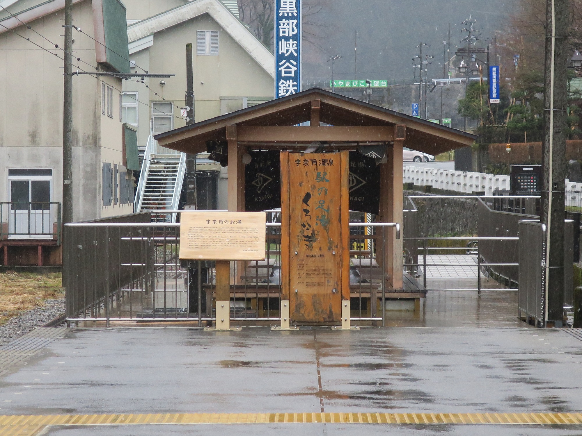 ホームの端には、駅の足湯くろなぎがあります。誰でも無料で入れます。