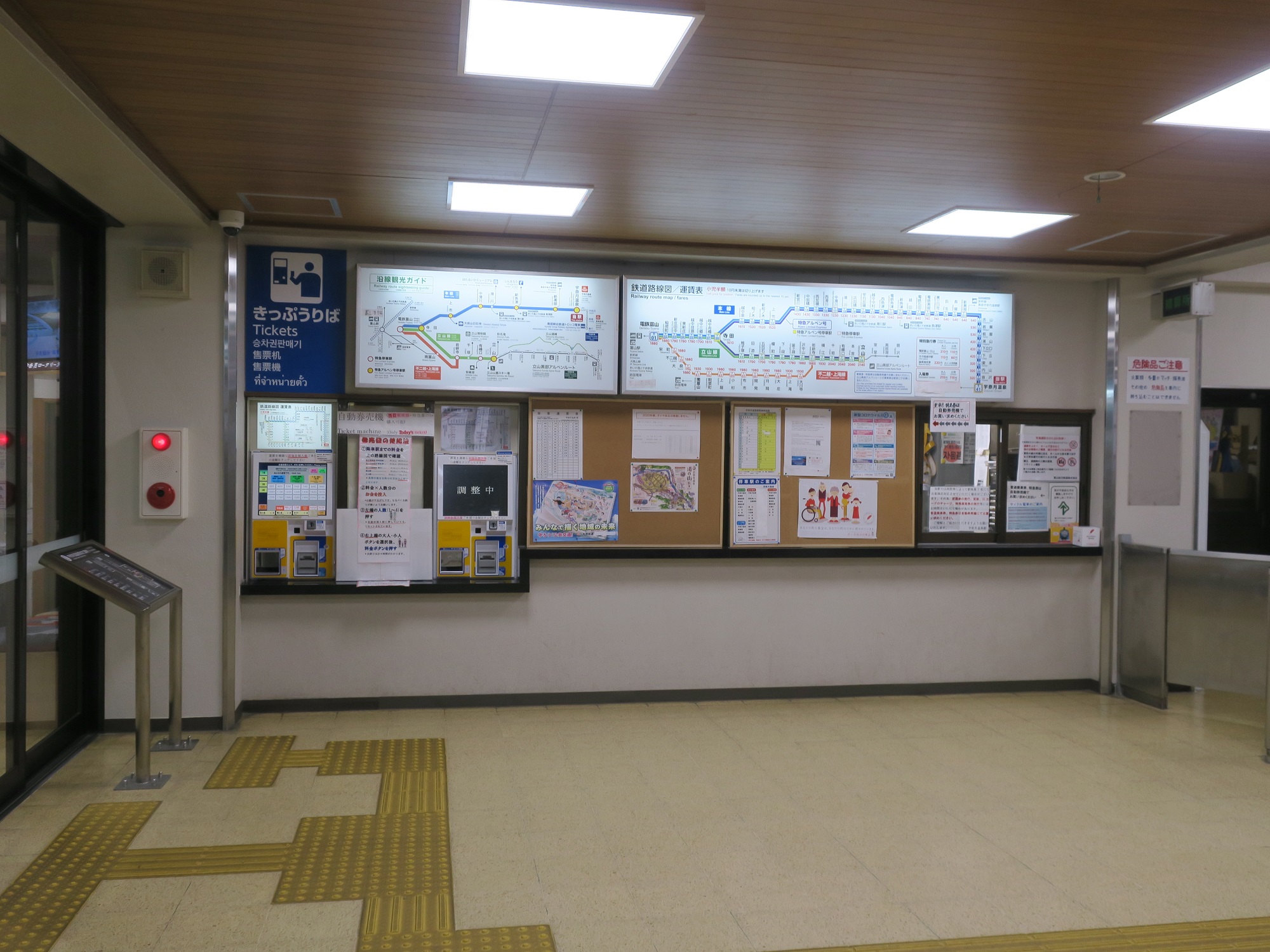 改札口です。なんとも昭和のレトロを感じます。列車の発車時間に合わせて改札口が開く仕組みです。ICカードリーダーが置いてありますが、SuicaやPASMOなどの交通系ICカードは使えません。