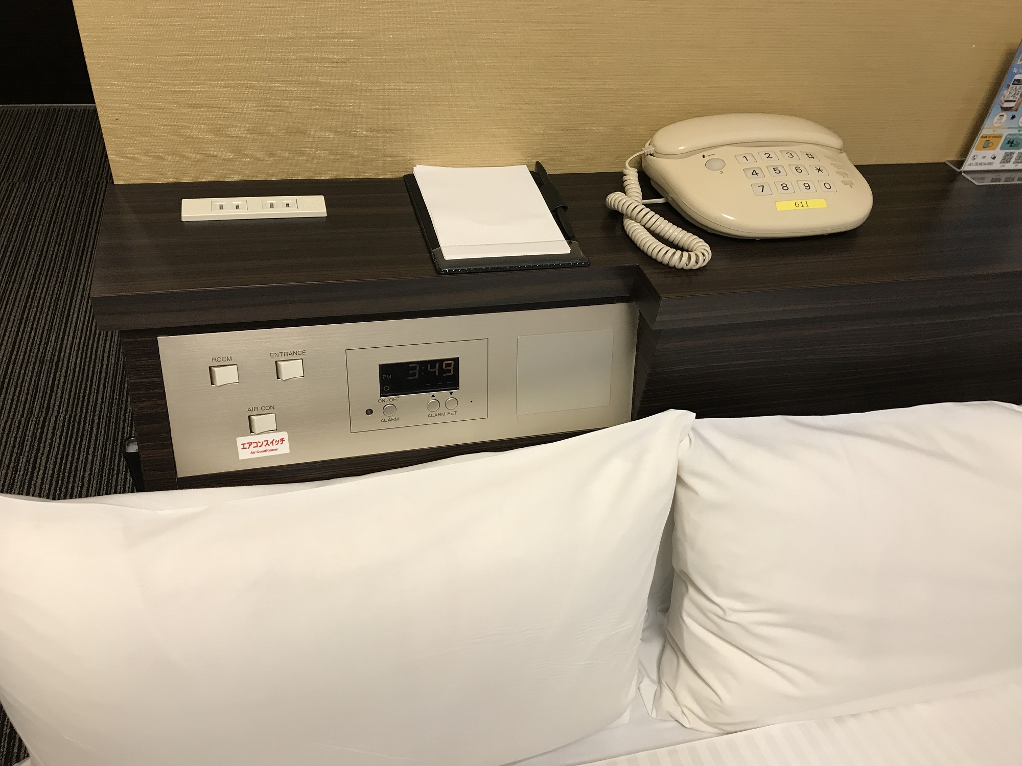 枕元にはACコンセントがあります。これ、ケータイやスマホを枕元に置いたまま充電できるので、とってもありがたいです。枕元にはその他、電話とスイッチ類、時計、非常灯があります。