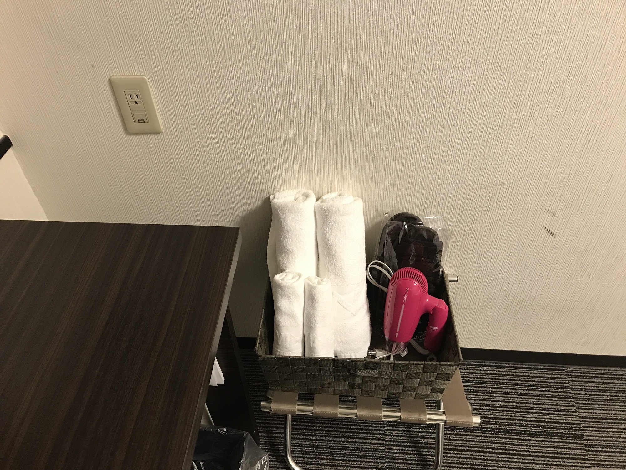 デスクの隣には、更にACコンセントが付いています。また、タオルとドライヤー、スリッパがあります。キューティー吉本的に気に入ったのが、スリッパ。これが履き心地が良くて、気持ちいいですね。