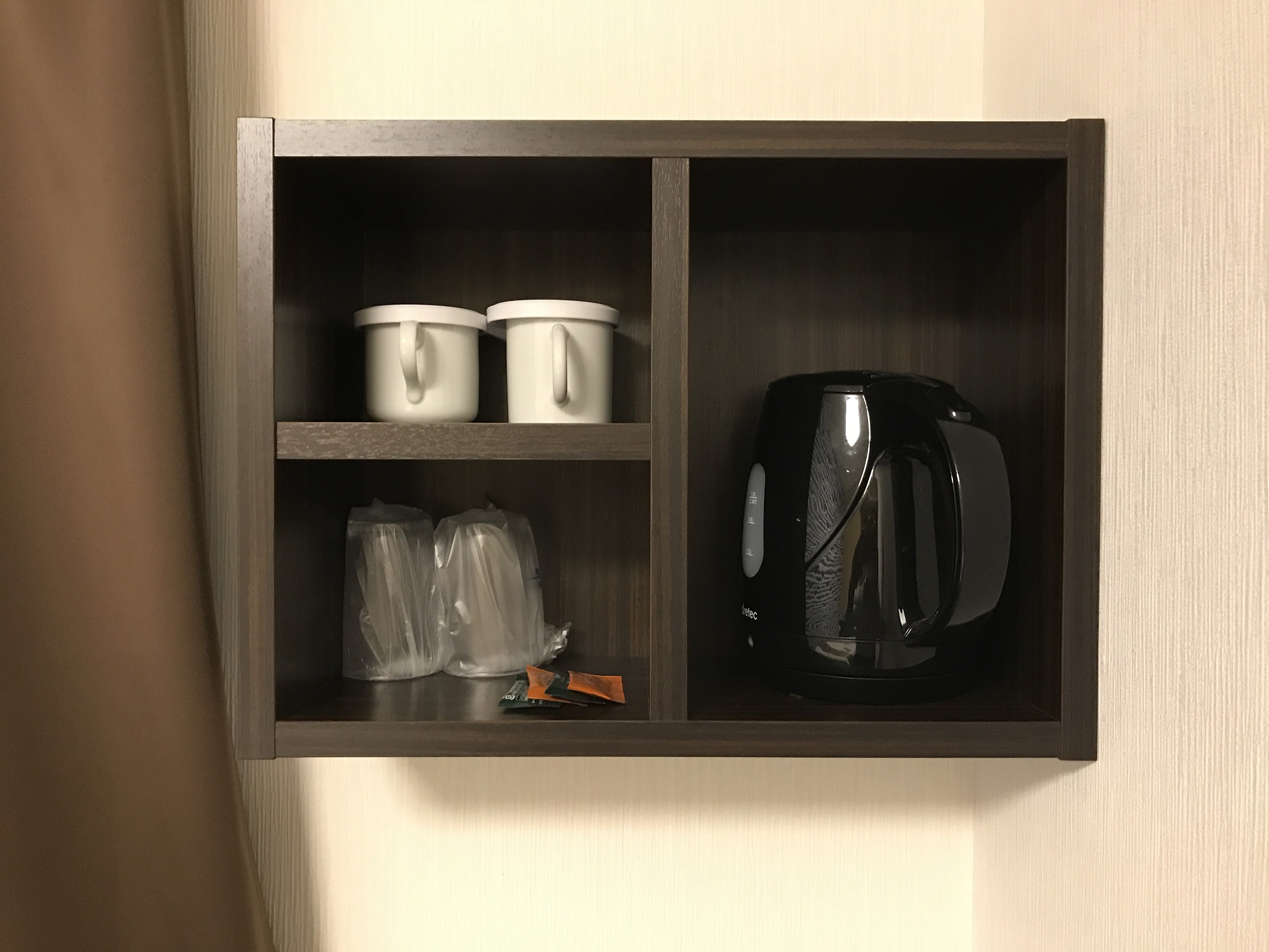 マグカップとコップ、電気ポットは壁に設置されている棚に置いてあります。