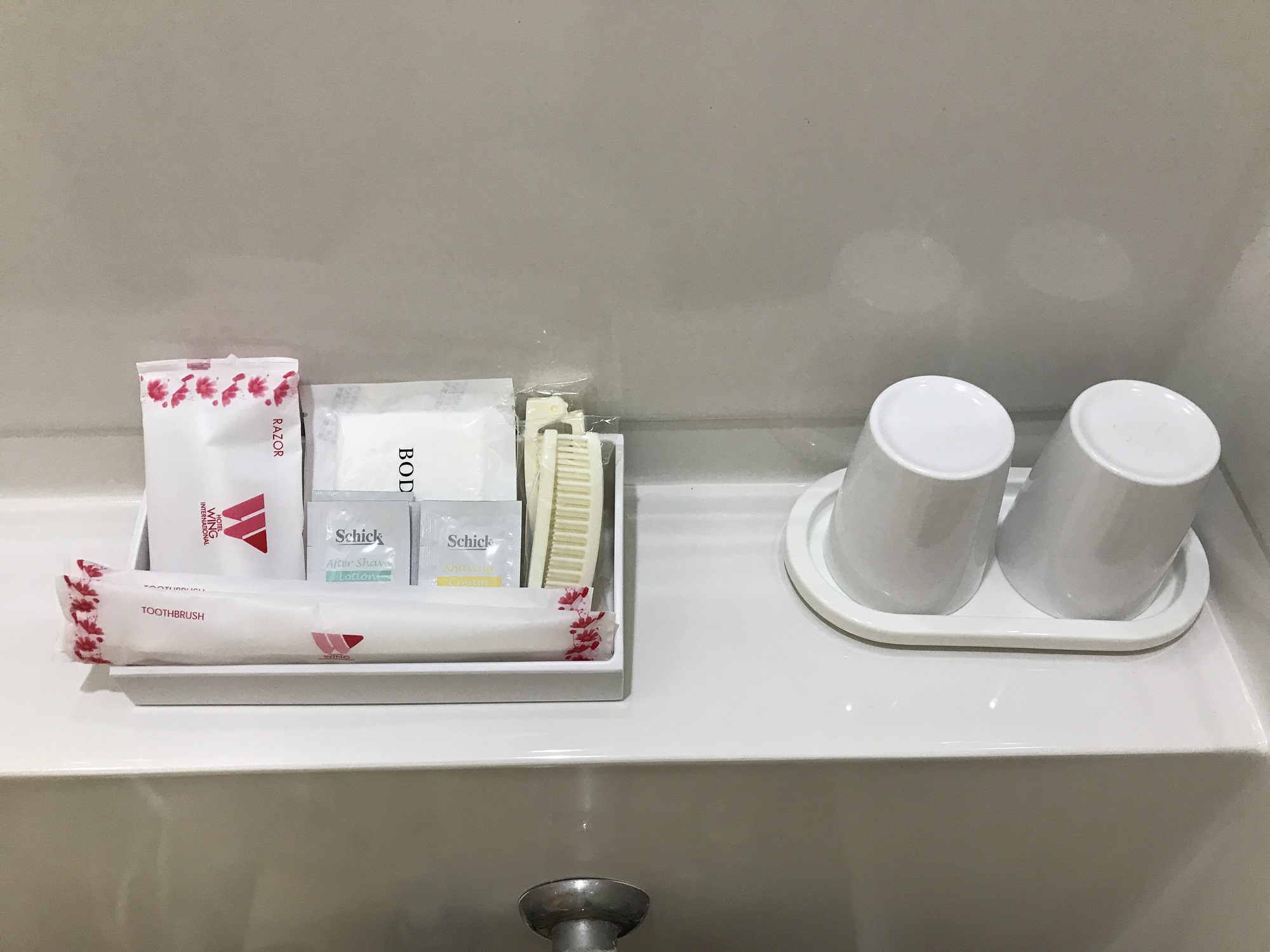 更に、バスルームの中に、タオルをかけるところがどこにもありません。なので、お風呂に入るときにバスタオルを持ち込んだり、洗面台で歯磨きをするときにタオルを持ち込んだりしても、タオルをかけておくことができないんです。なので、トイレの上にタオルを置いて、お風呂に入る始末。で、洗面台で顔を洗うときは、タオルを首にかけるしかない感じです。