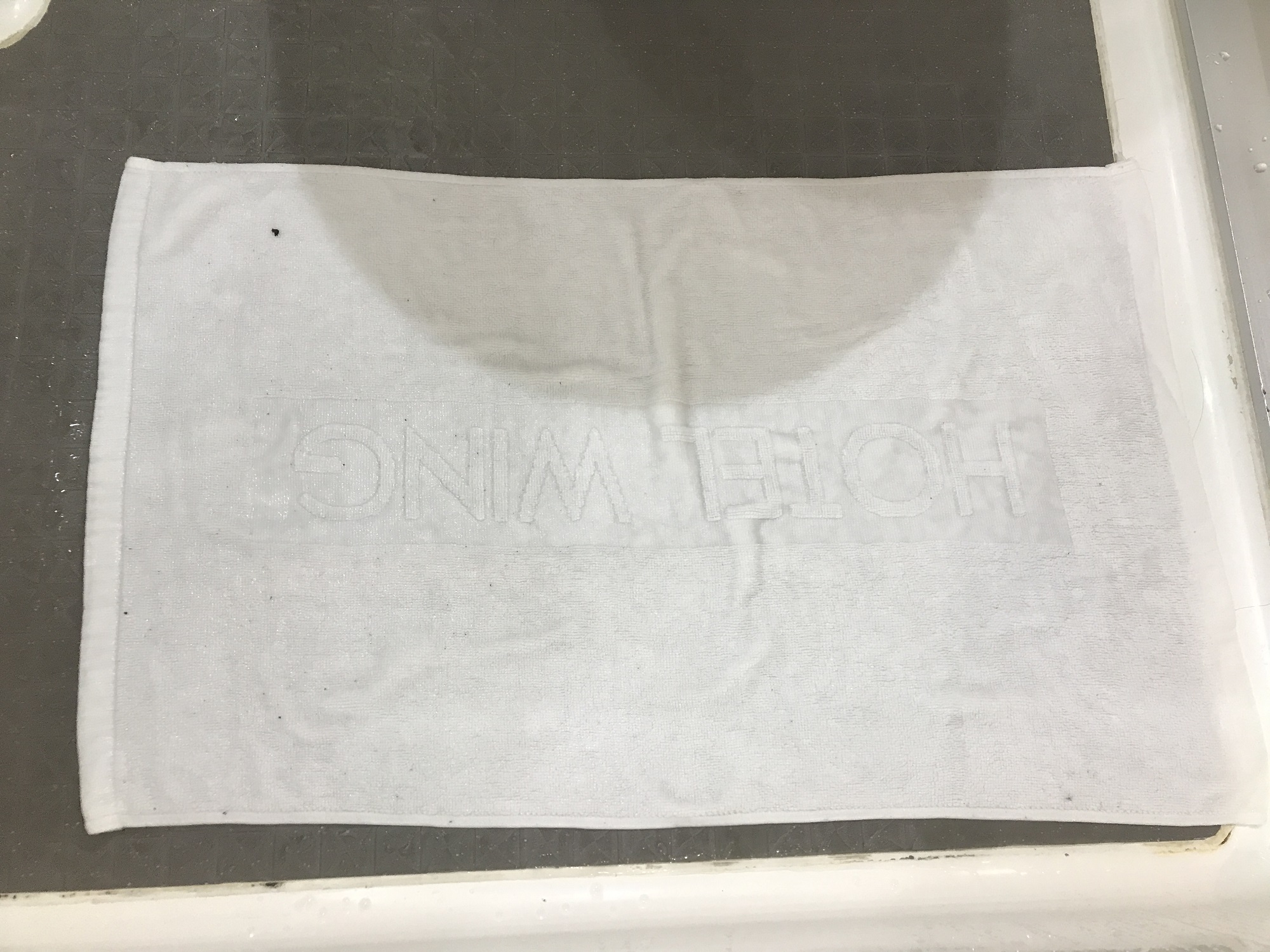 こちらが証拠写真。結果、お湯はひいたものの、バスルームに敷いた足ふきが、ご覧の通りぐしょぐしょ。もはや足ふきとしての用を足さない結果に。