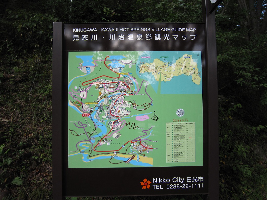 薬師の湯の近くに、観光マップがありました。川治温泉って、鬼怒川温泉から更に先に行ったところにあるんですけど、鬼怒川温泉見たく重厚長大な巨大温泉ホテルが立ち並んでいるわけではなく、ちょっとひなびた温泉宿って感じの旅館が立ち並んでいます。なので、ゆっくりしたい人だったら、川治温泉の方がいいかもしれません。