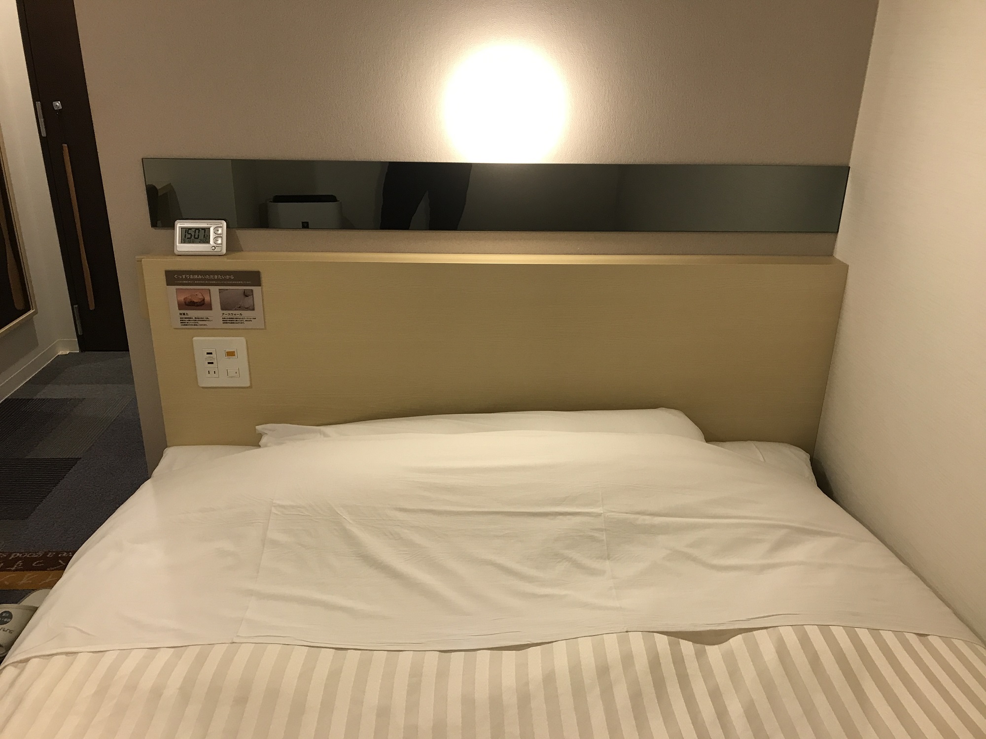 で、照明のスイッチはどこにあるのかというと、枕元にあります。この手のホテルの常識といえばそうなのですが、照明のスイッチは枕元だけではなくて、扉の脇にも付けてほしいですね。