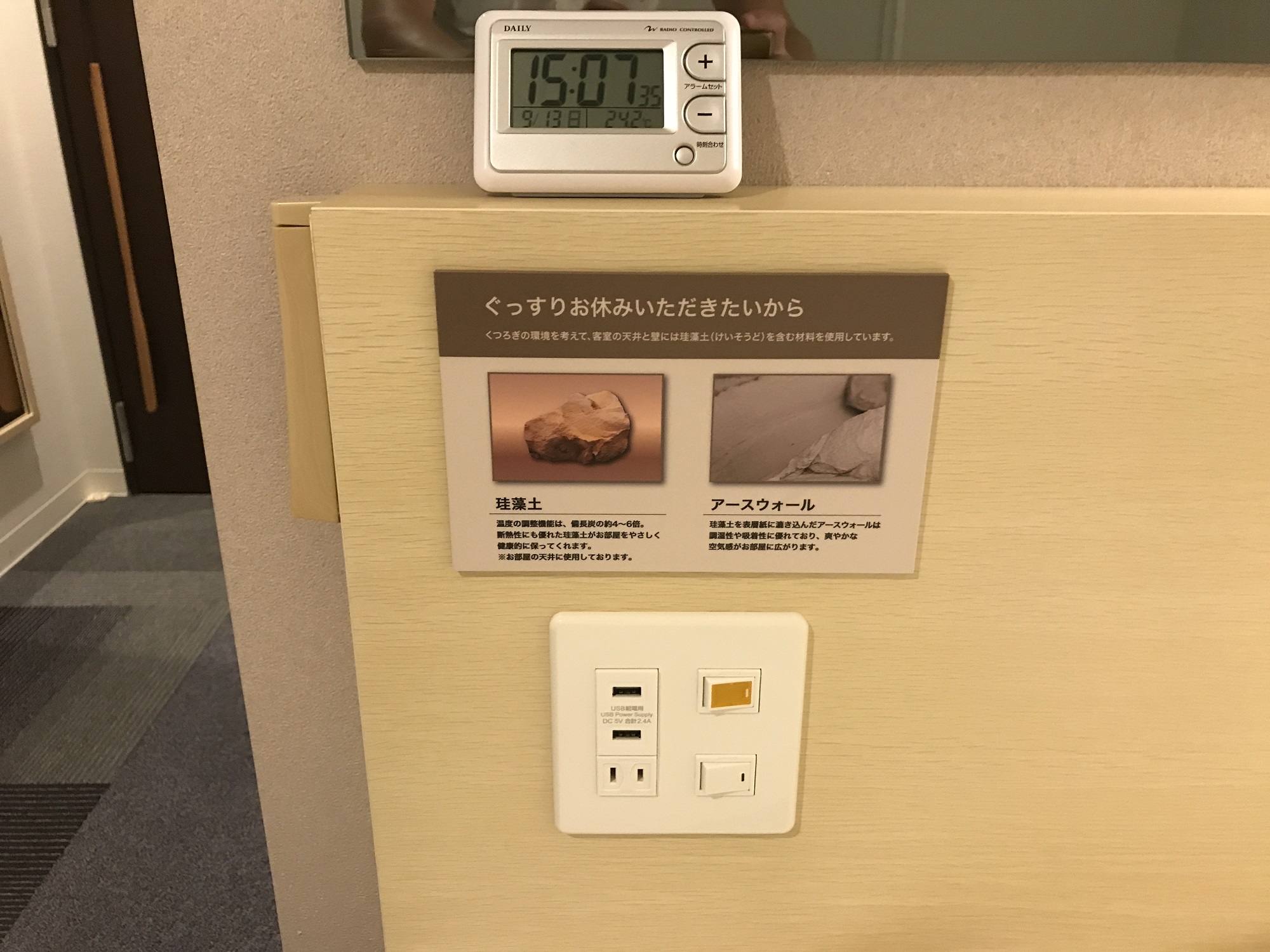 スーパーホテル 東京・芝 シングルルーム 枕元 照明のスイッチとACコンセント、USBポート、目覚まし時計があります