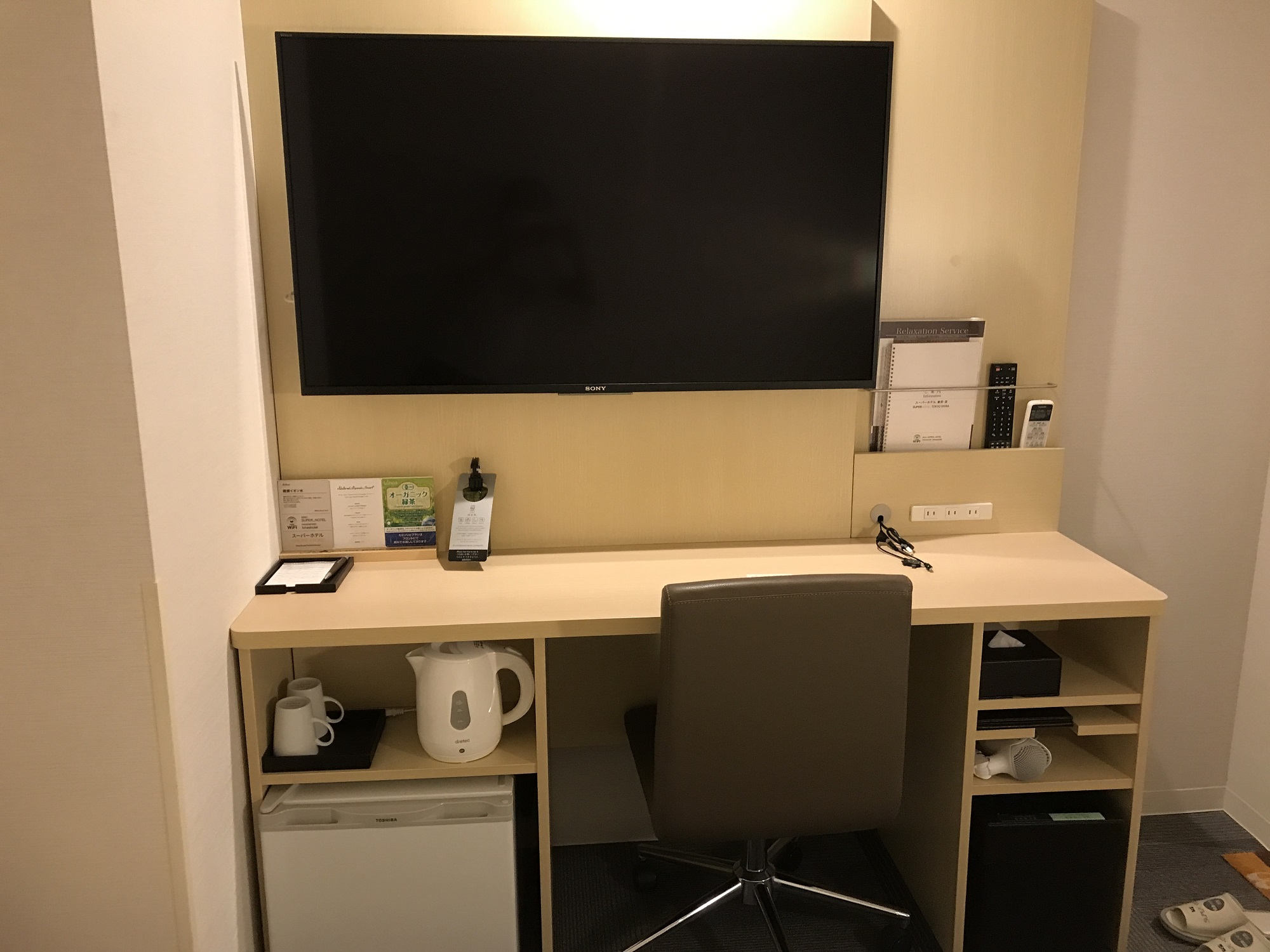 スーパーホテル 東京・芝 シングルルーム デスク左下 マグカップ、電子ケトル、冷蔵庫があります