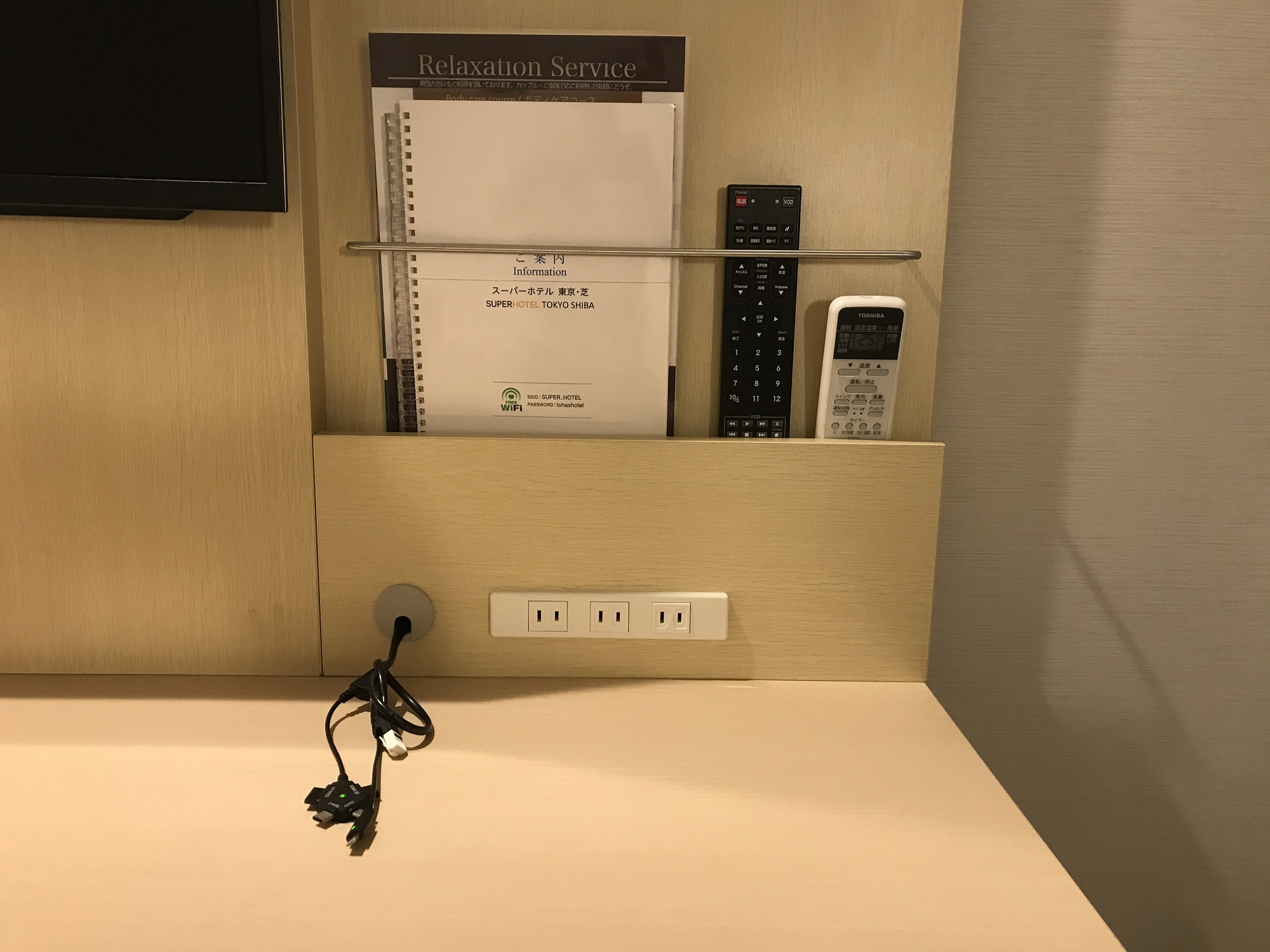 スーパーホテル 東京・芝 シングルルーム デスク右側 ケータイ充電器とACコンセントがあります