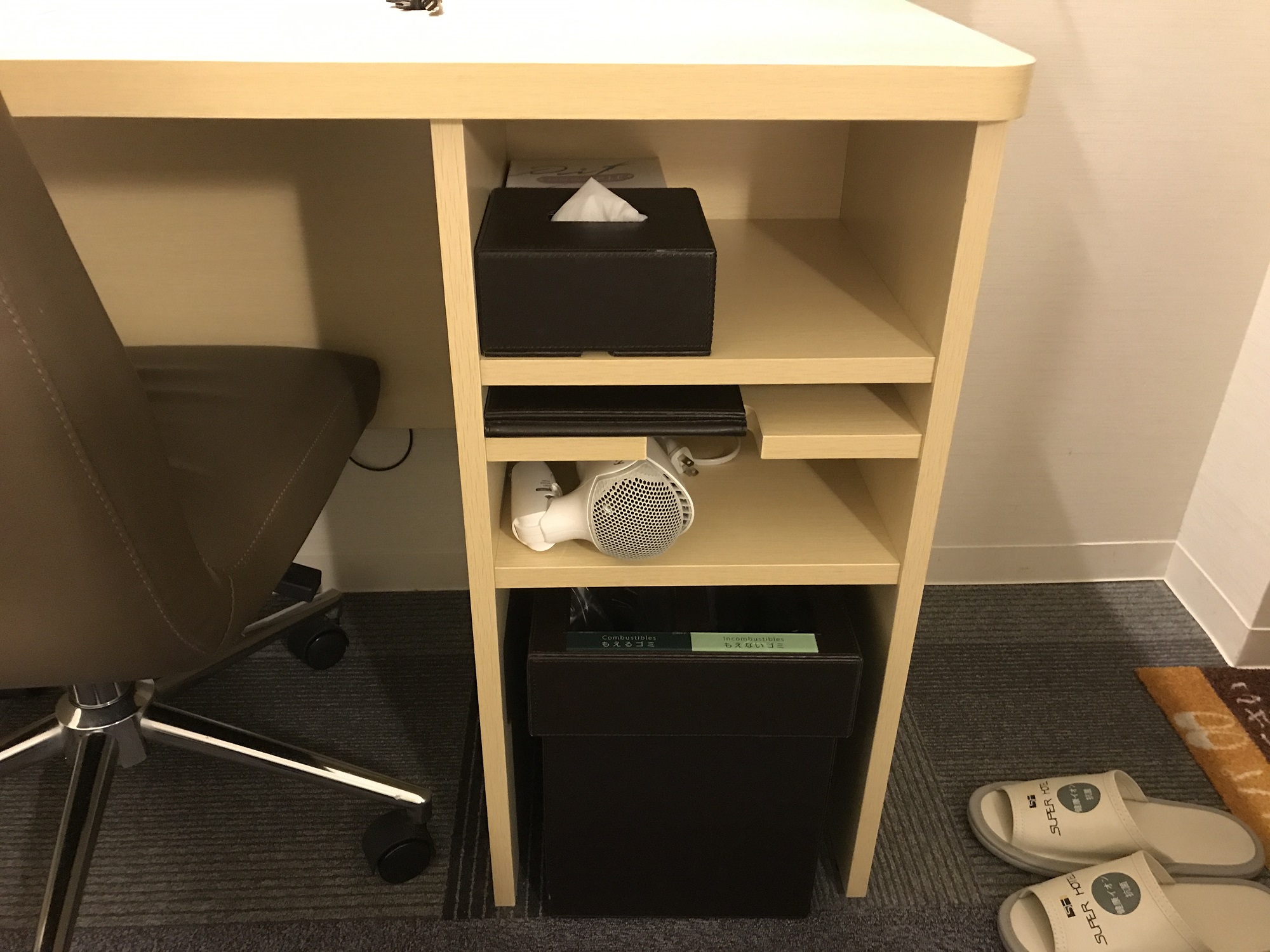 スーパーホテル 東京・芝 シングルルーム デスク右下 ティッシュ・鏡・ドライヤー・ゴミ箱があります
