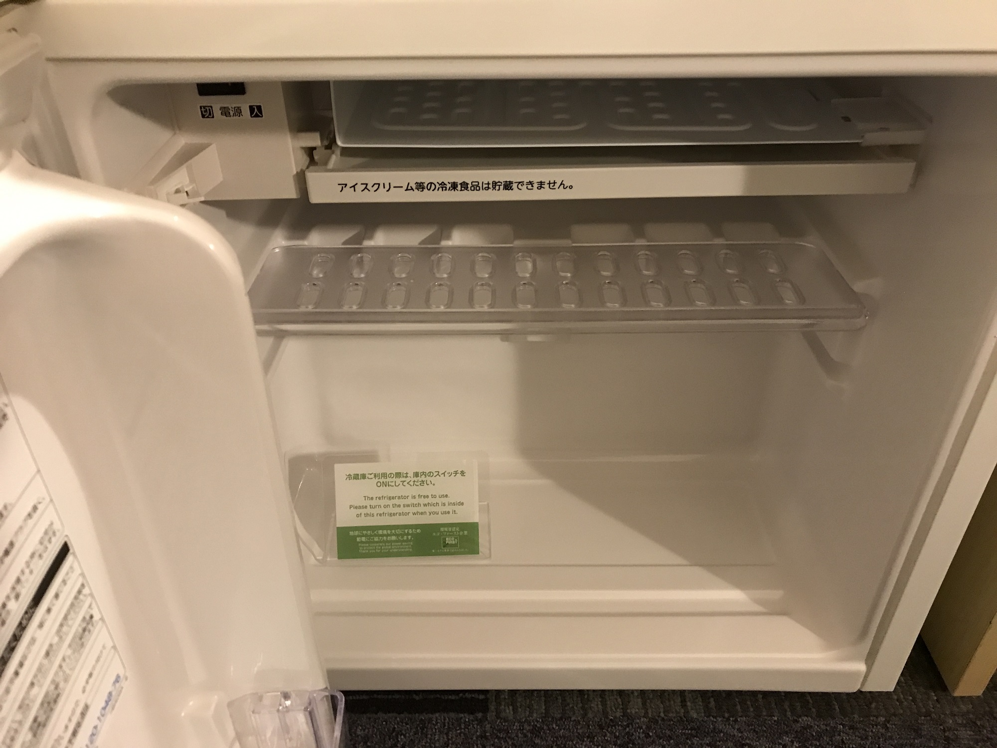 スーパーホテル 東京・芝 シングルルーム 冷蔵庫の中 左上にスイッチがあります