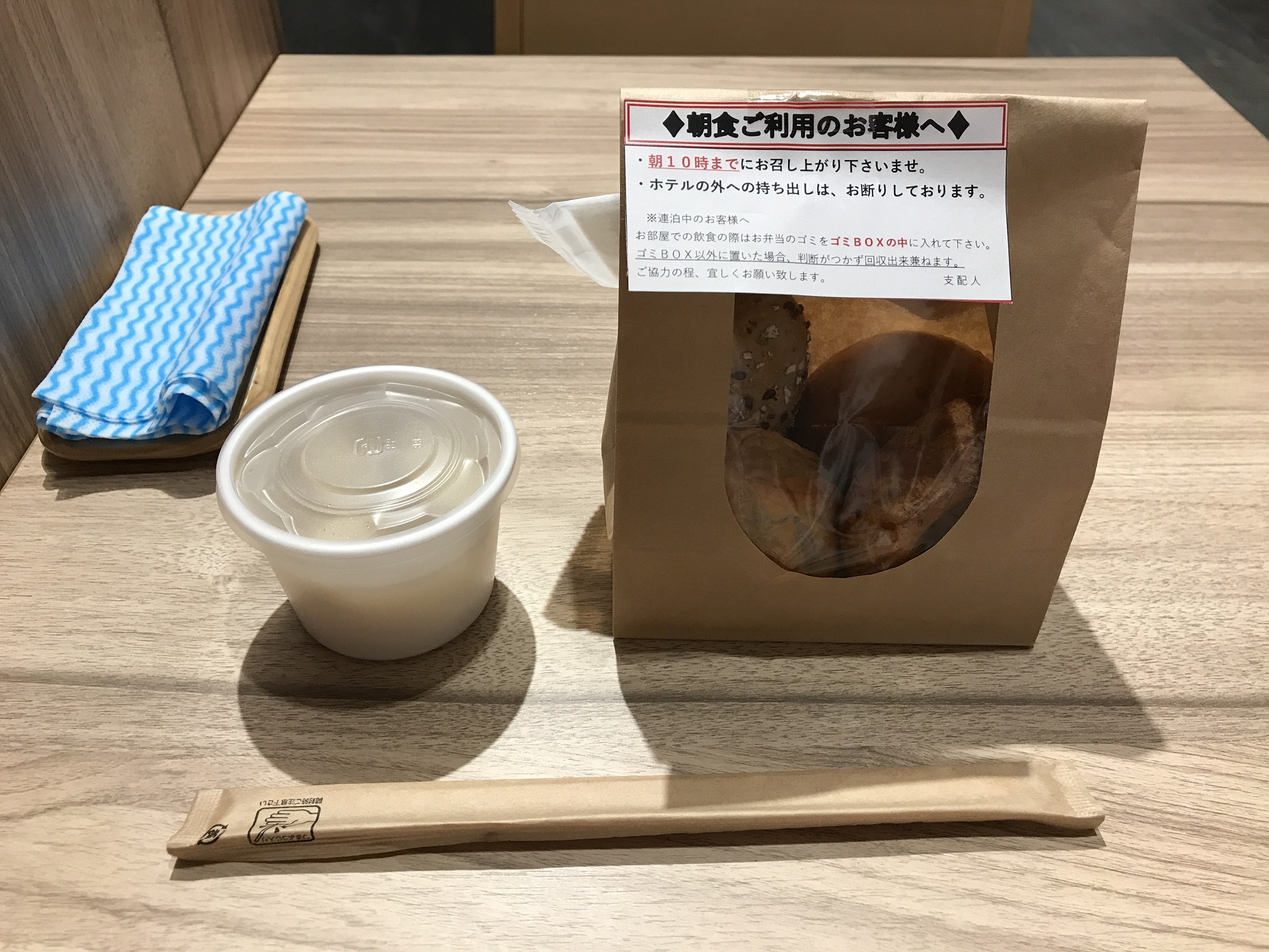 スーパーホテルといえば健康朝食無料、なのですが。新型コロナの影響で、ビュッフェスタイルの朝ご飯は休止。その代わり、お弁当を配っていました。キューティー吉本が行ったときには、お弁当が2種類と、サンドイッチとおにぎりの詰め合わせ、パンの詰め合わせの4種類の中から選べました。