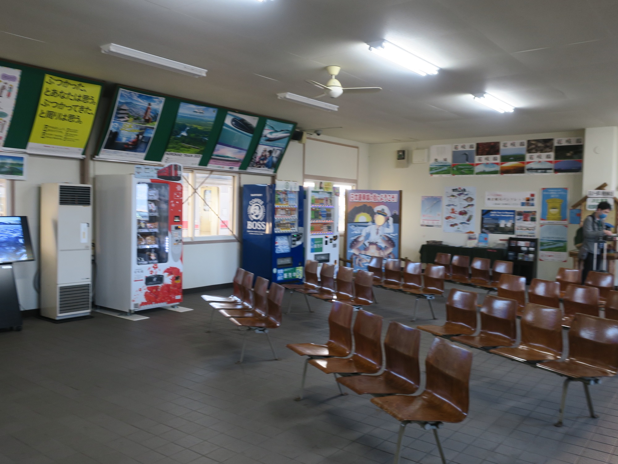待合室です。自動販売機が並んでいますが、売店はありません。