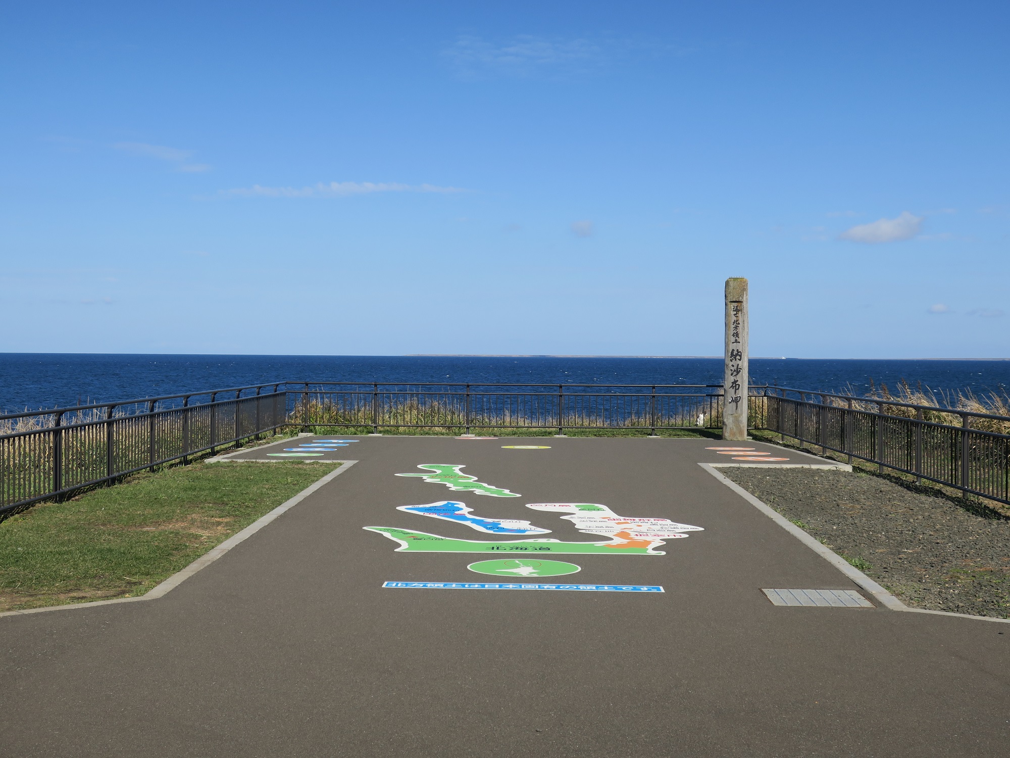 納沙布岬バス停の周辺は、望郷の岬公園になっています。望郷の岬公園の東端に撮影スポットがありまして、「返せ北方領土」と書いてあります。
