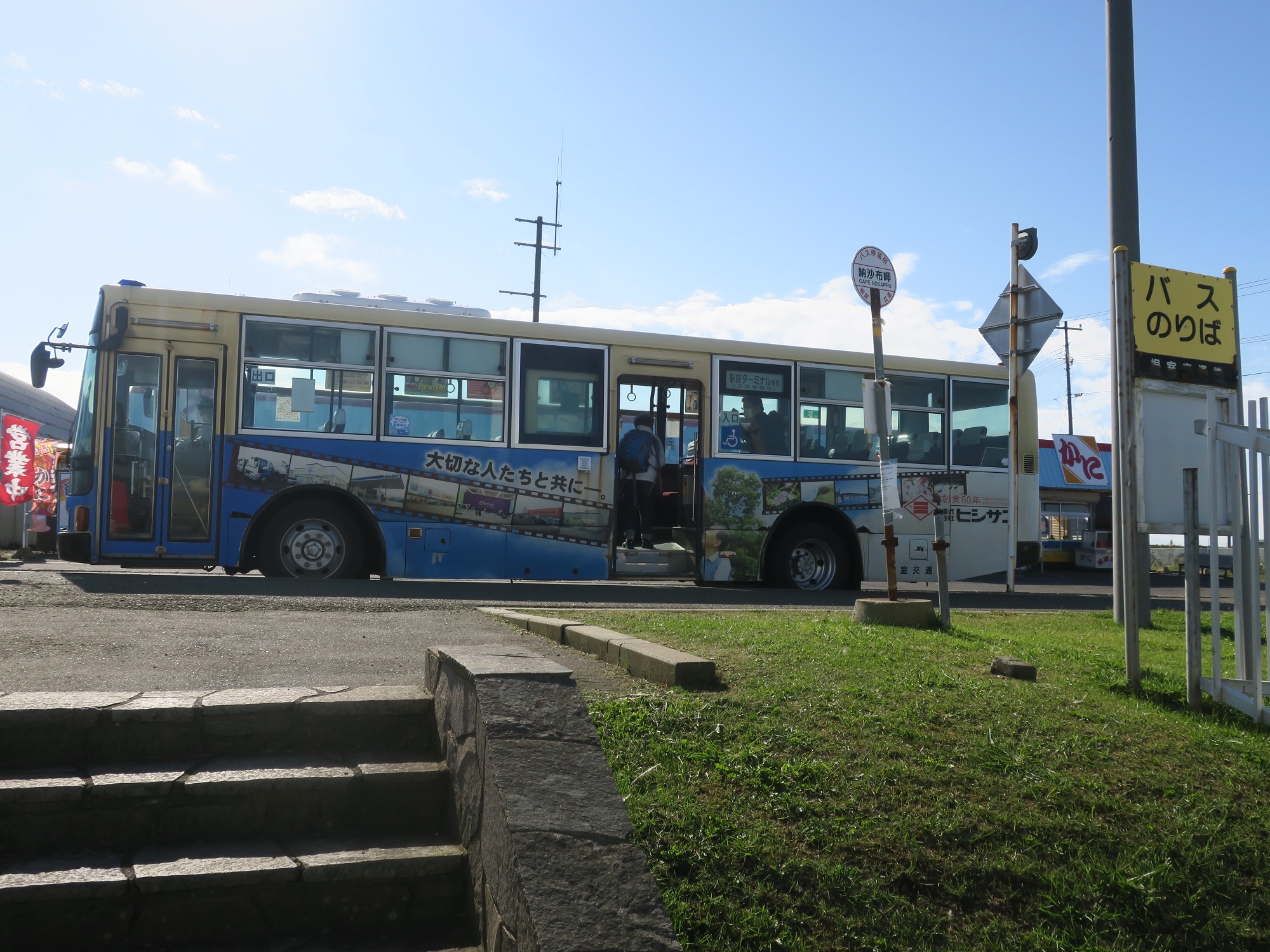 日本最東端のバス停、納沙布岬バス停留所です。ここは降り場でして、根室駅前バスターミナル方面行きのバスは、道路を挟んで反対側のバス停に来ます。
