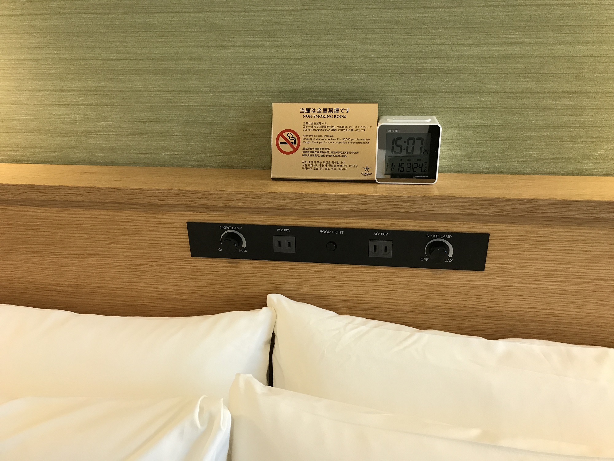 ちょうど枕元の位置に、ACコンセントと照明のスイッチ、目覚まし時計があります。枕元でケータイやスマホを充電できるのはありがたいですね。