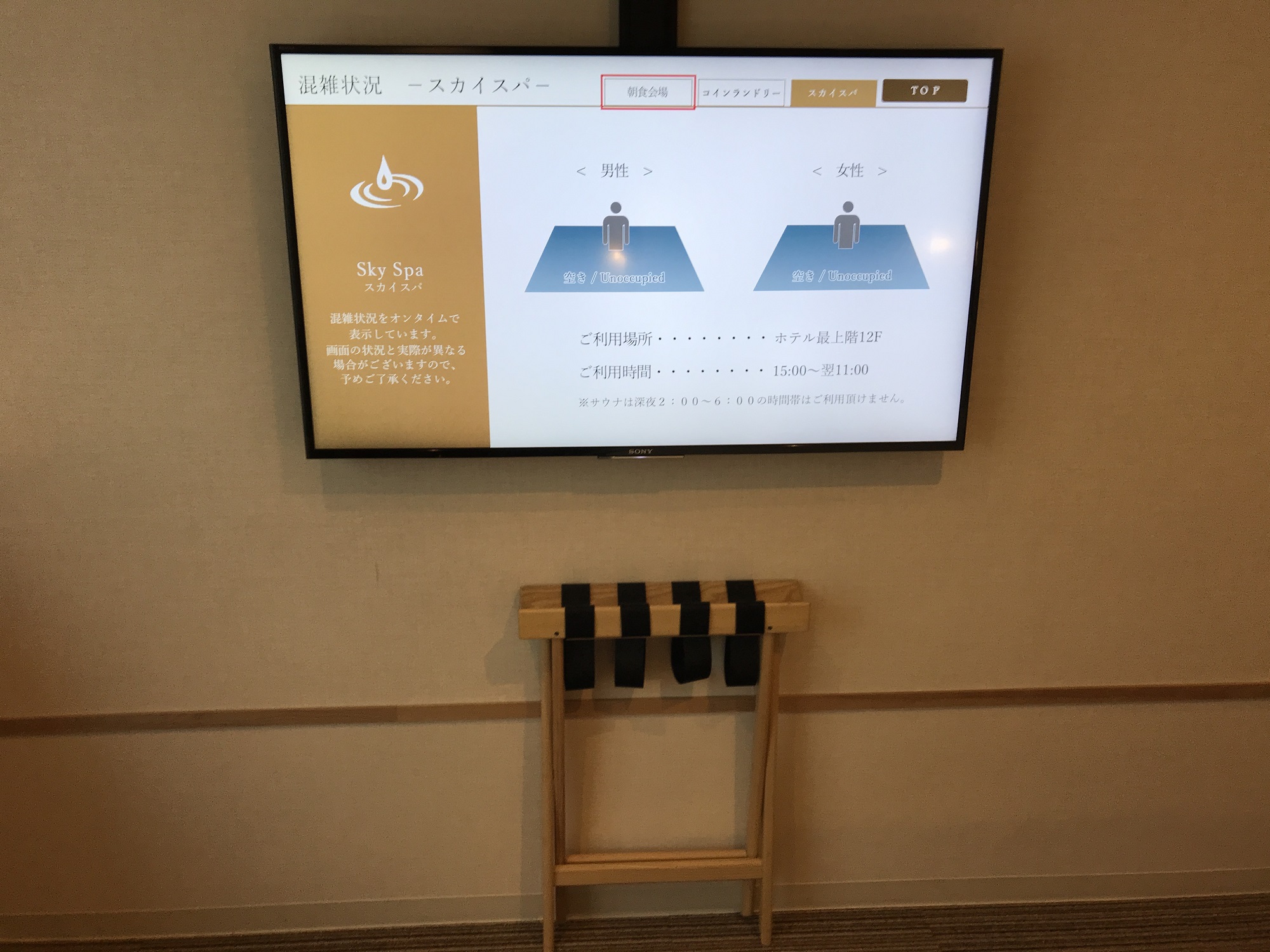 ベッドと反対側の壁に、でっかい液晶テレビがあります。この液晶テレビで、朝食会場・コインランドリー・大浴場の混み具合がわかるという優れもの。ただし、ベッドに寝っ転がった状態や、こあがりソファーでくつろぎながらテレビを見ることはできるのですが、デスクでPCを操作しながらテレビを見ることができないのが欠点です。