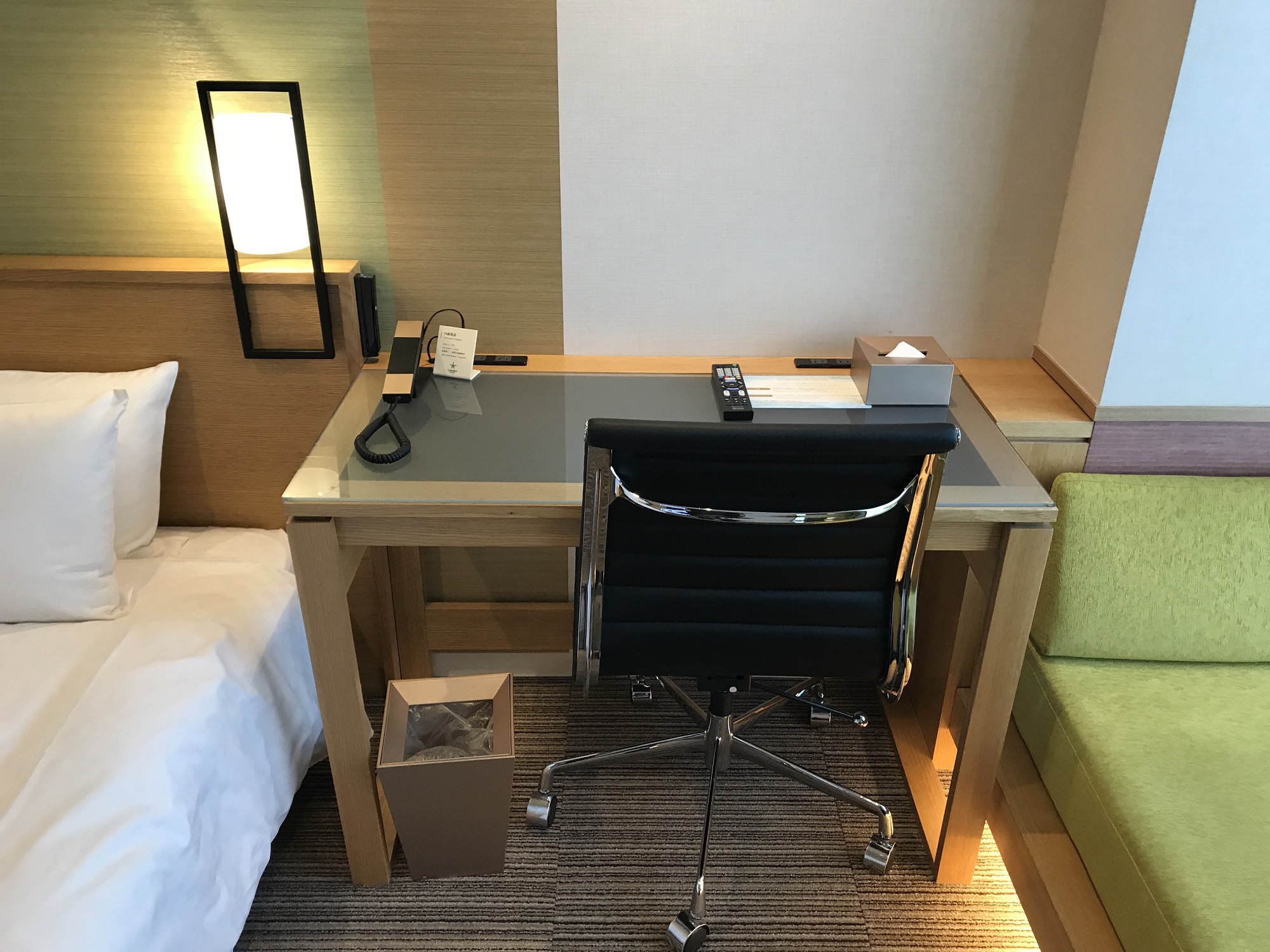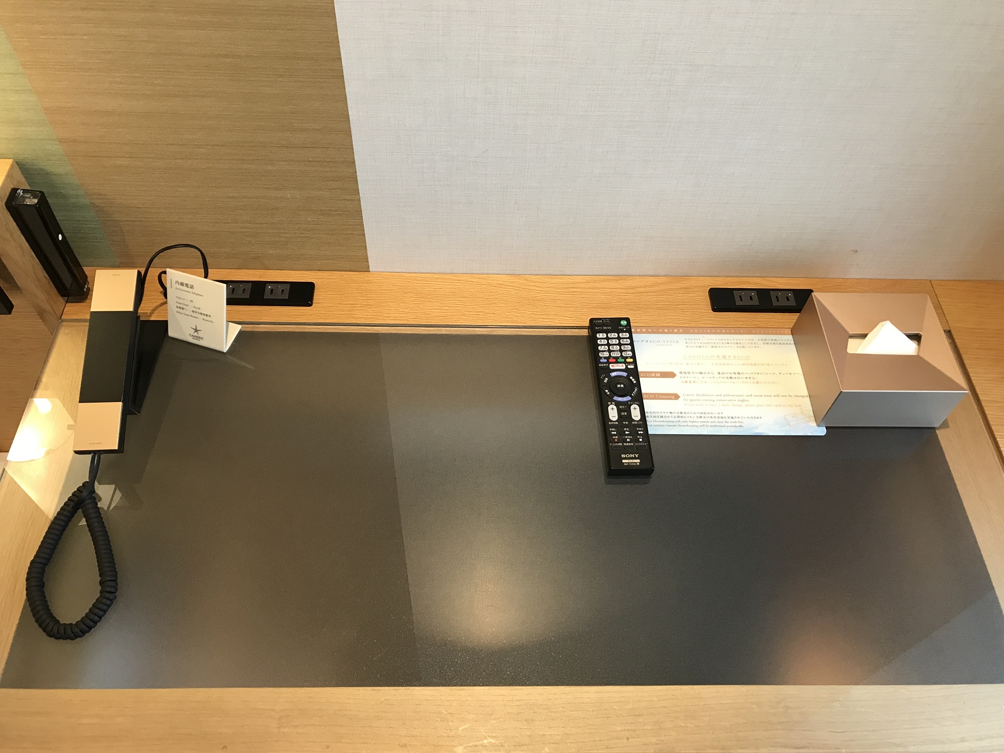 デスク上には非常灯とACコンセント、電話、テレビのリモコン、ティッシュがあります。ACコンセントは数、使い勝手共に申し分ありませんでした。