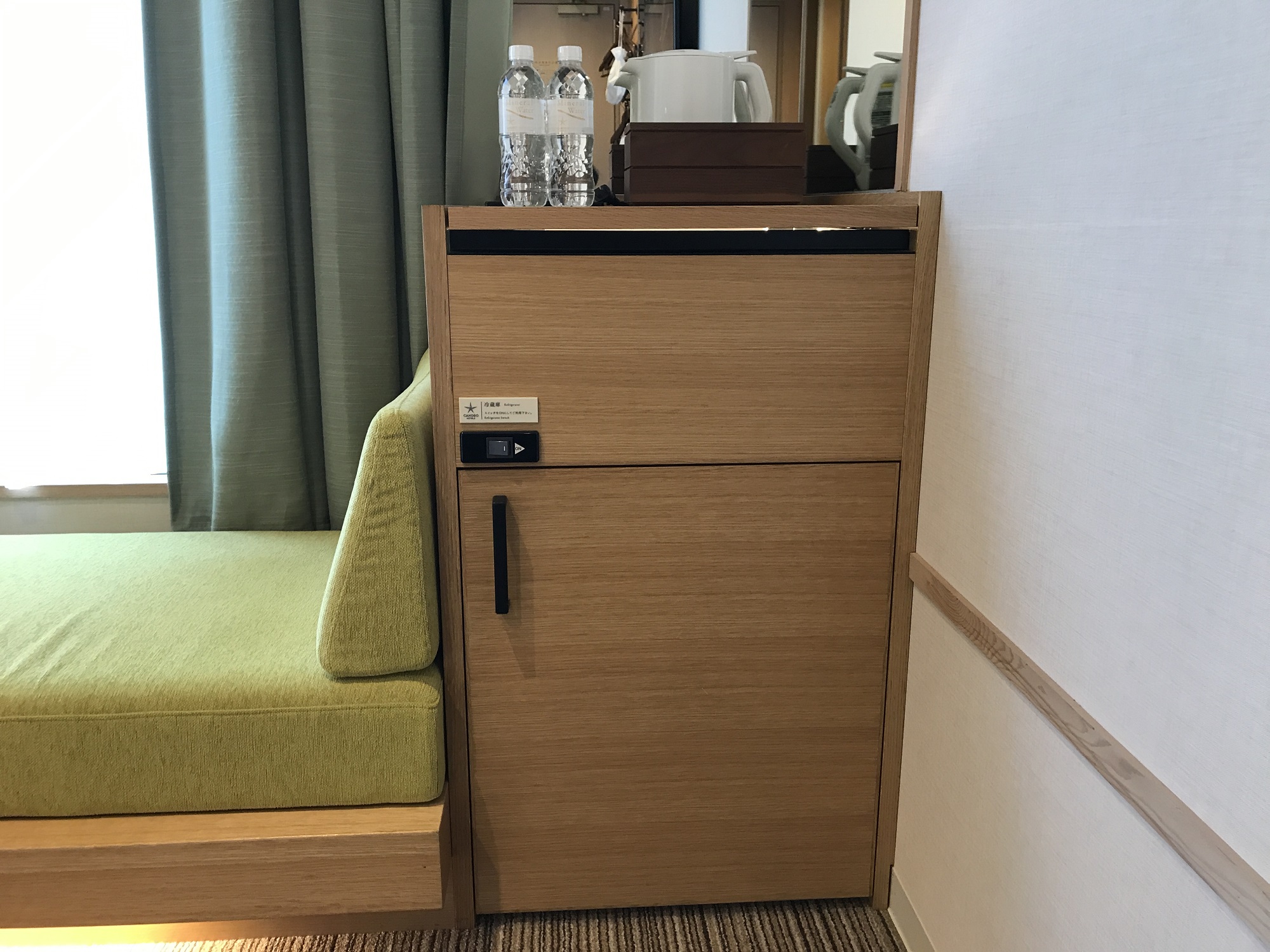 冷蔵庫の上が、テーブルになっています。ミネラルウォーターと電気ポット、アメニティ類、ガラスコップ、マグカップ、飲み物、アイスペールがあります。ミネラルウォーターとドリップ式のコーヒーが置いてある点と、ガラスコップとアイスペールがある点が嬉しいですね。