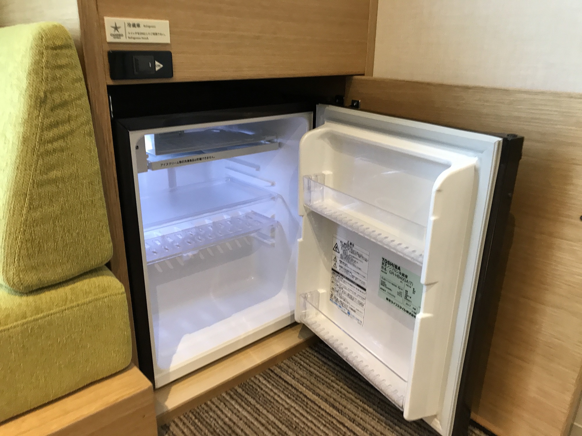冷蔵庫の中は空で、スイッチを切ることもできます。冷蔵庫は小さめで、ドアポケットに350ml缶やペットボトルを入れることはできません。冷蔵庫本体に500mlペットボトルを入れようとすると、高さが足りずに棚に引っかかるという・・・